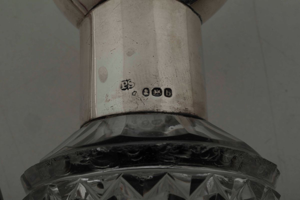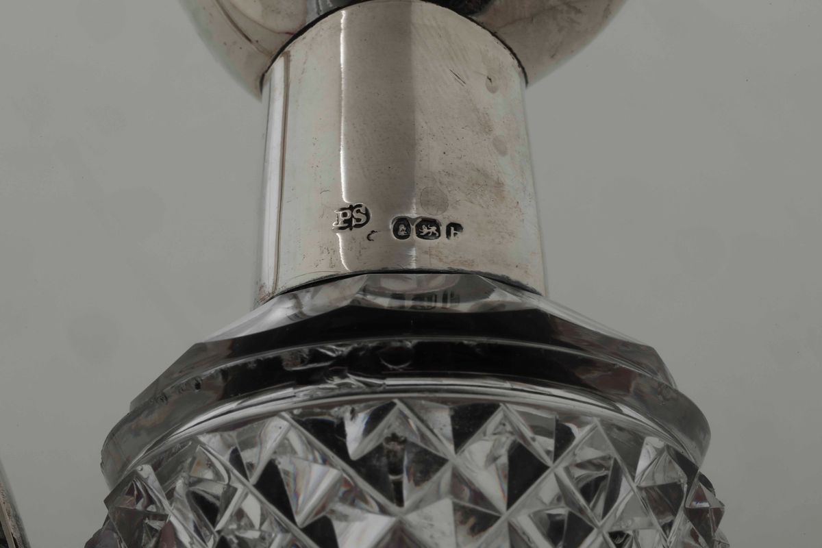 Coppia di ampolle in cristallo molato e argento. Inghilterra XIX secolo (Londra?) anno 1817. Marchio dell'argentiere Paul [..]