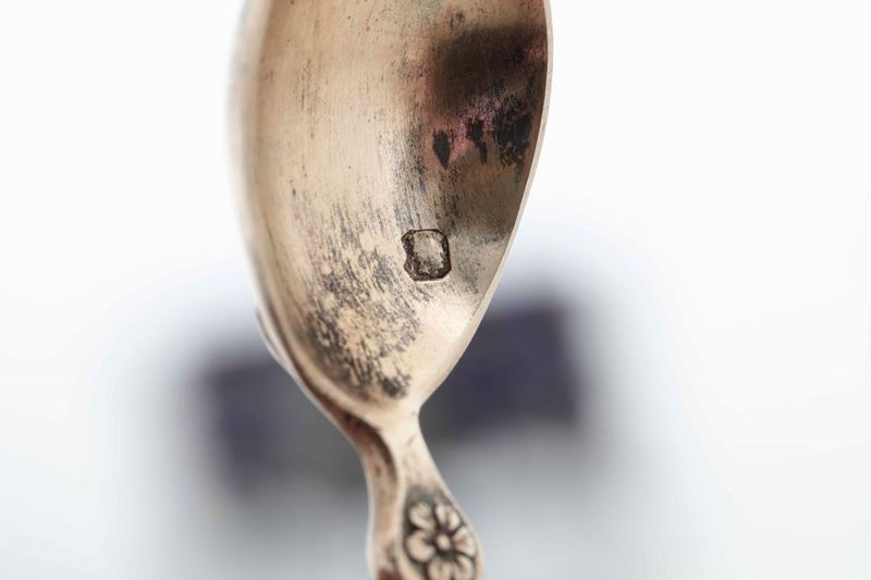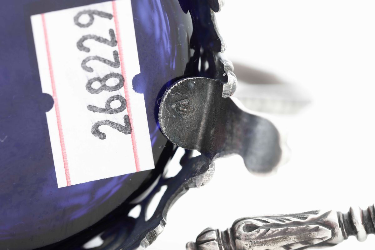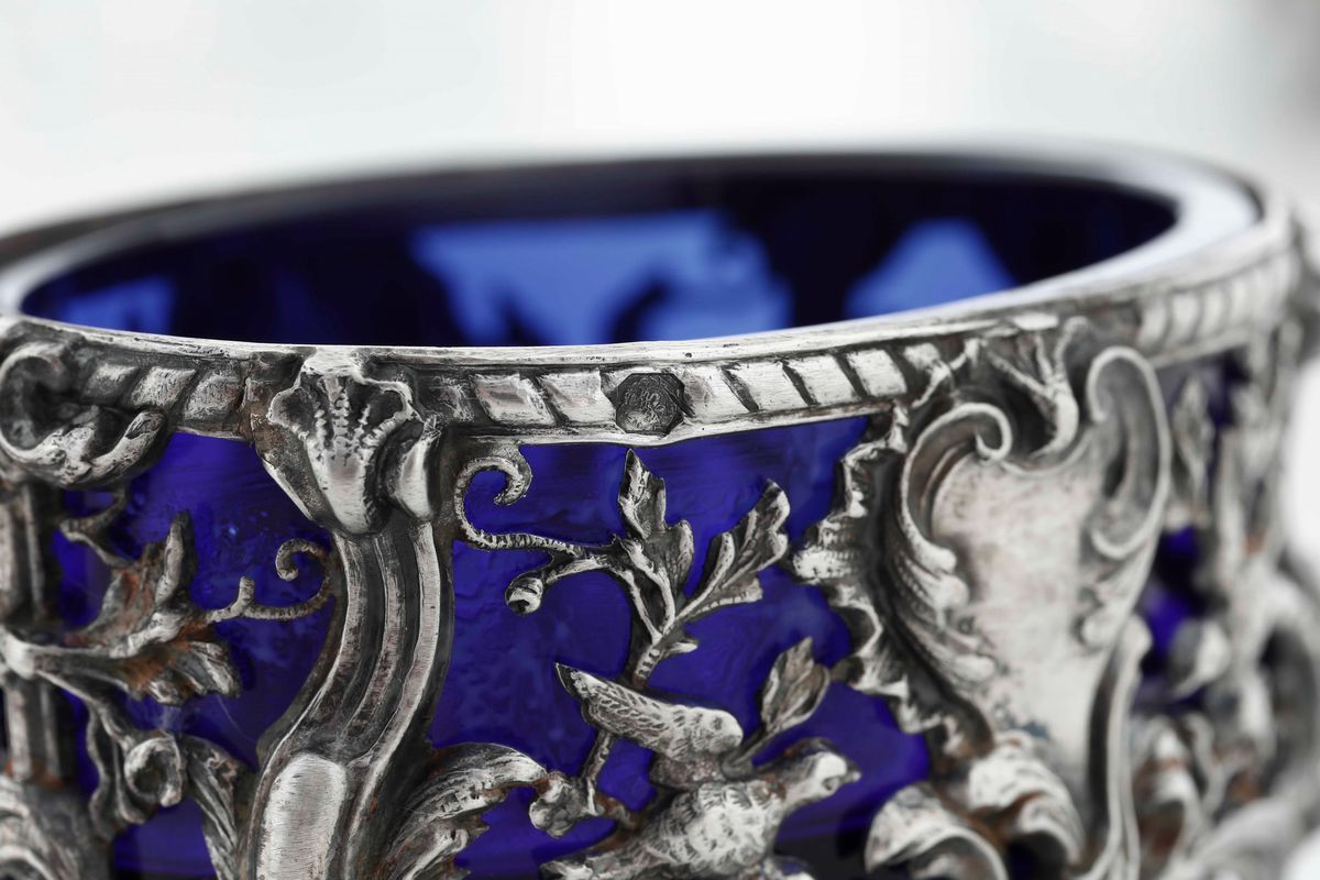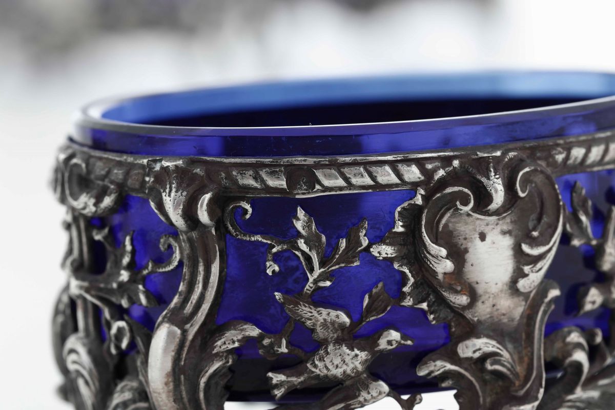 Mostardiera e sei saliere in argento primo titolo fuso, traforato e cesellato e vetro blu cobalto. Francia fine del XIX secolo