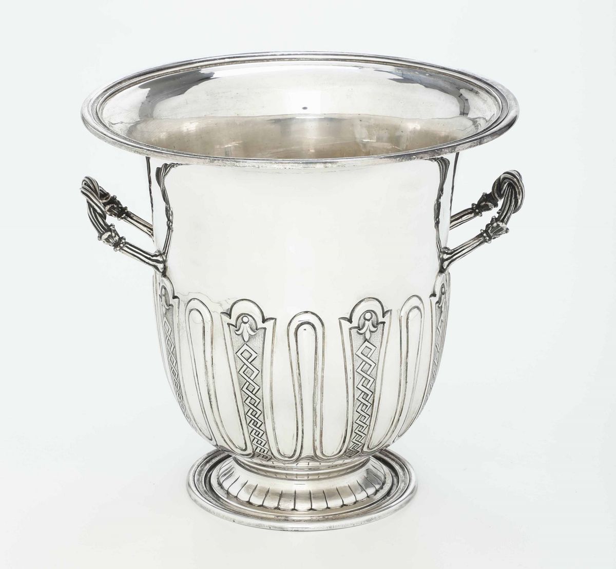 corpo liscio con festoni cesellati sbalzati. Anse cordate e base circolare gradinata