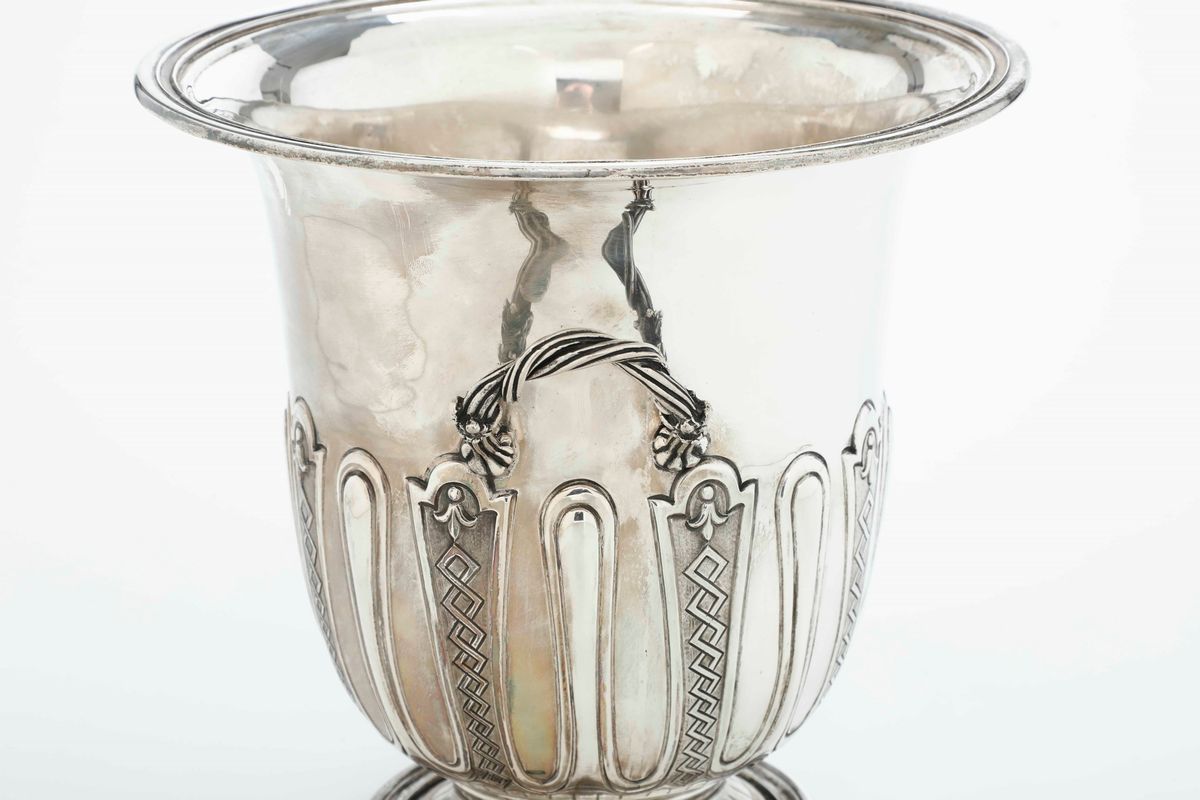 Porta champagne. Argento fuso e sagomato. Argenteria milanese del XX secolo. Argentieri F.lli Cacchione