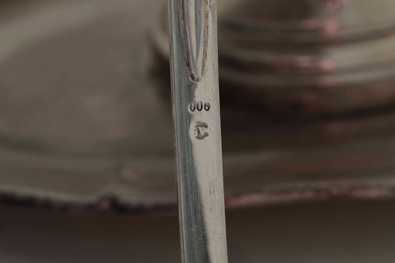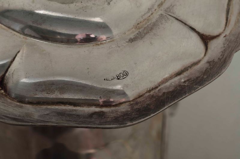 Salsiera in argento fuso e cesellato. Argenteria milanese del XX secolo. Marchio col fascio littorio in uso dal 1935 al 1945. Argentiere Pasquale Alignani & Alignani Mariano