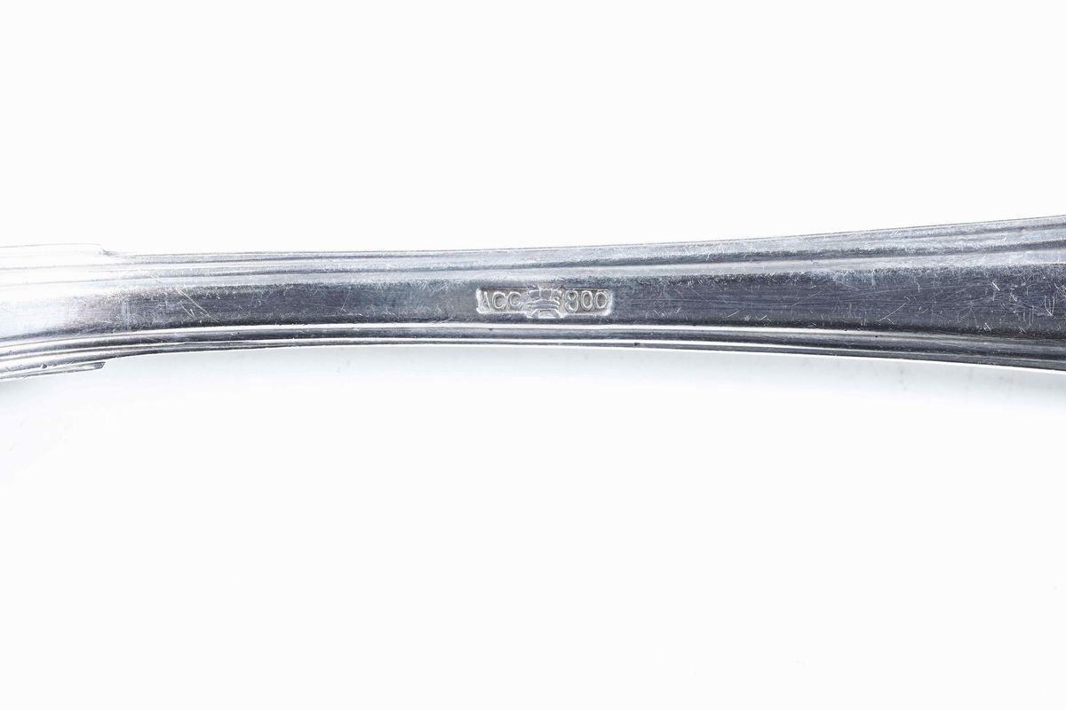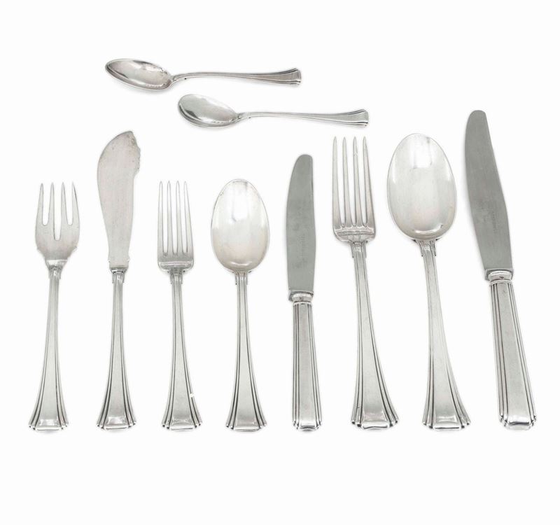 Servizio di posate da dodici in argento fuso e cesellato. Argenteria italiana del XX secolo. Argentiere Cesa, Alessandria [..]