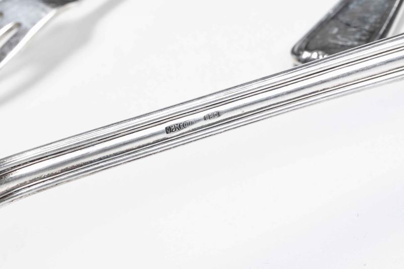 Servizio di posate in argento fuso e cesellato. Argenteria italiana del XX secolo. Argentiere Clementi, Bologna