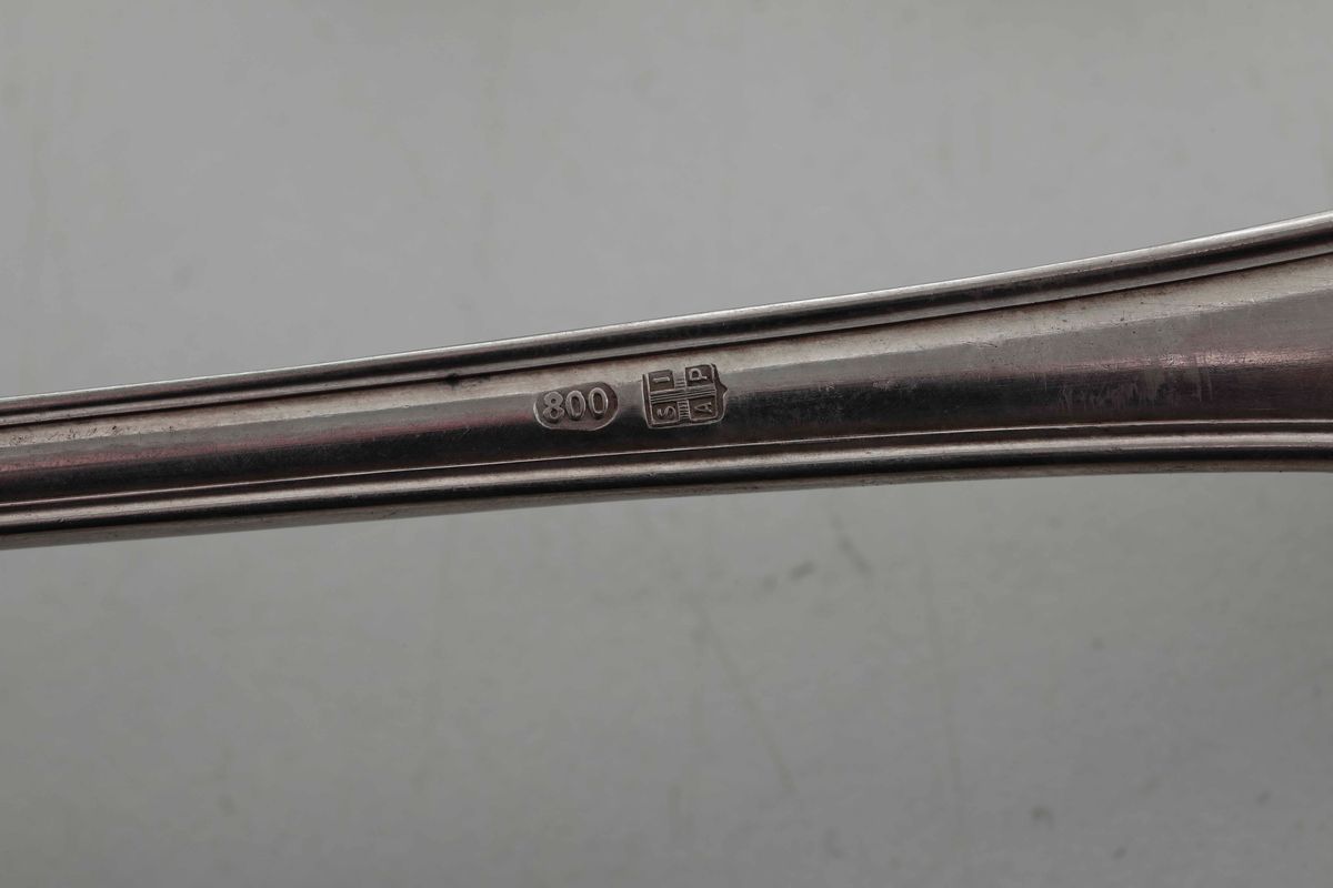 Composto da 12 forchette, 12 coltelli, 12 cucchiai, 12 cucchiai più piccoli, 12 forchette da frutta, 12 coltelli da frutta, 12 forchette da pesce, 12 coltelli da pesce, 11 cucchiaini da caffè, 12 cucchiaini da tè, 10 posate a servire
