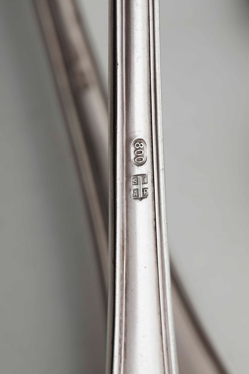 Servizio di posate in argento fuso e cesellato. Argenteria italiana del XX secolo. Argentiere S.I.A.P., Alessandria
