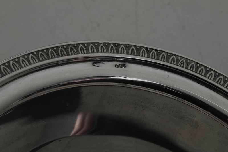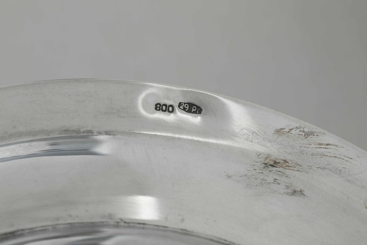 Set da dessert in argento fuso e cesellato. Argenteria veneta del XX secolo. Argentiere Rino Greggio, Padova