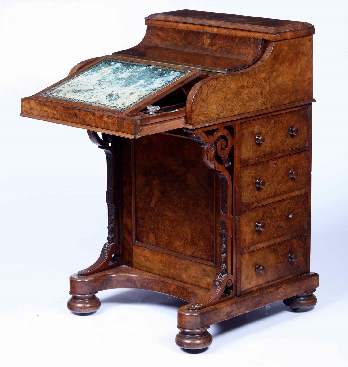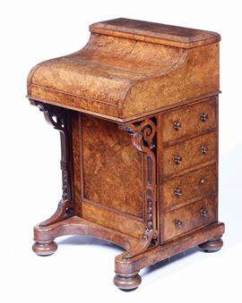 Piccolo scrittoio davenport lastronato in radica, Inghilterra XIX-XX secolo