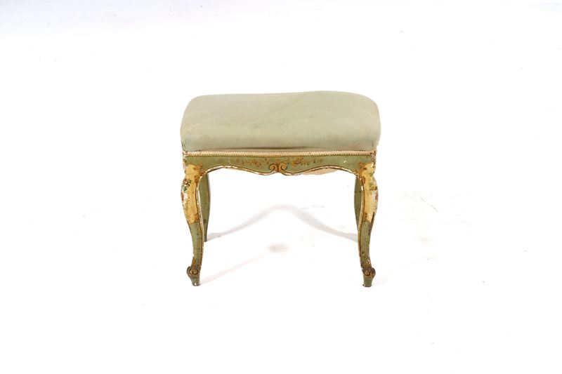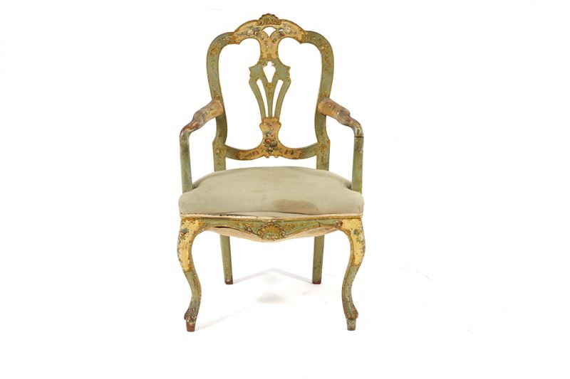 Poltrona e sgabello in legno dipinto. XVIII-XIX secolo