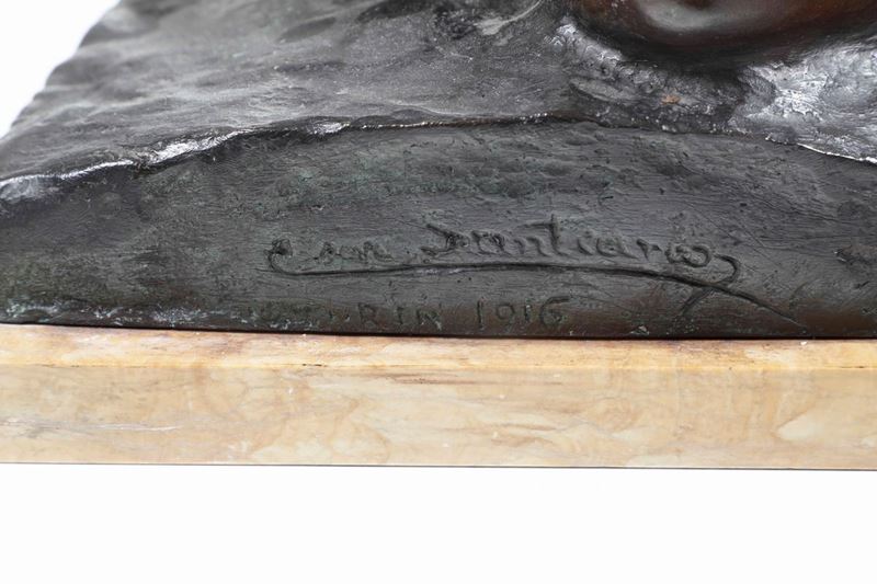 Scultira in bronzo su base in marmo. Firma e data incisi alla
