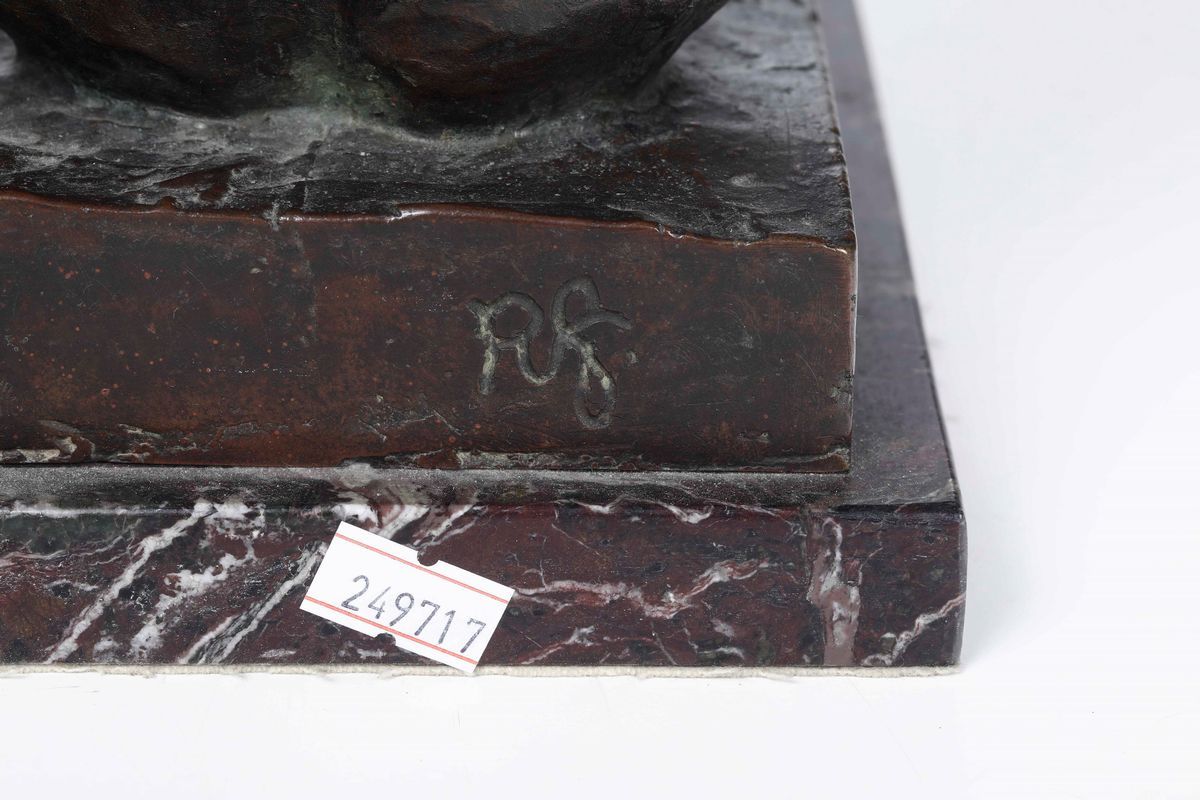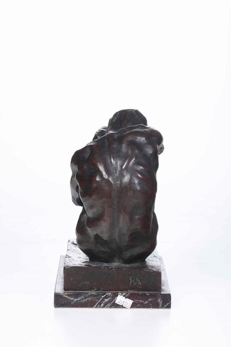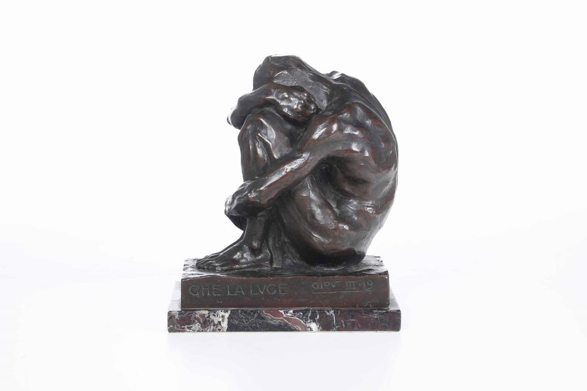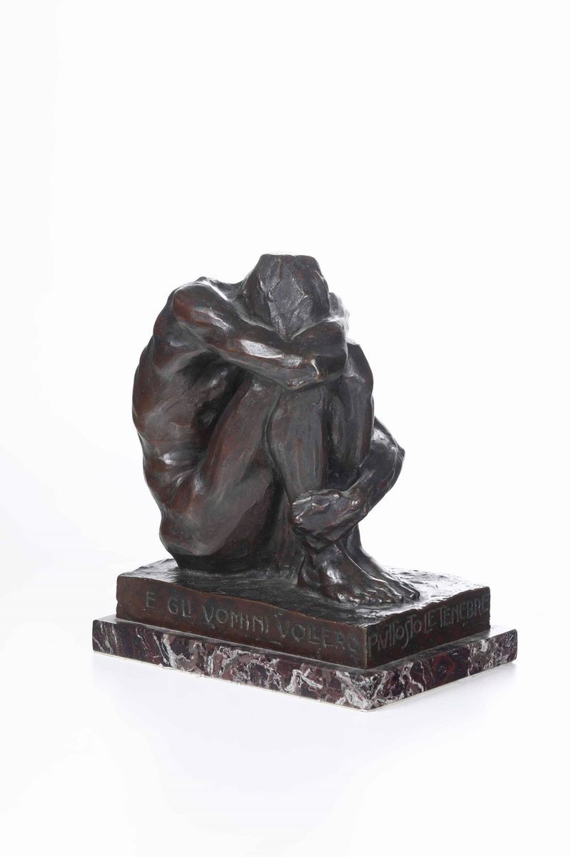 Scultura in bronzo. Siglato RG ed iscritto alla base: "E gli uomini vollero piuttosto le tenebre che la luce, Giov III 19"