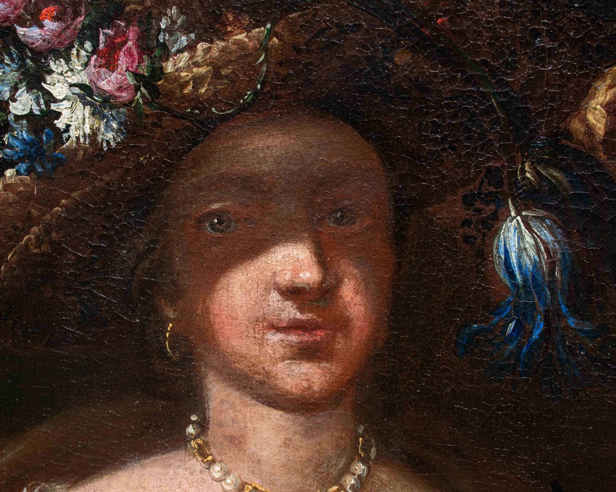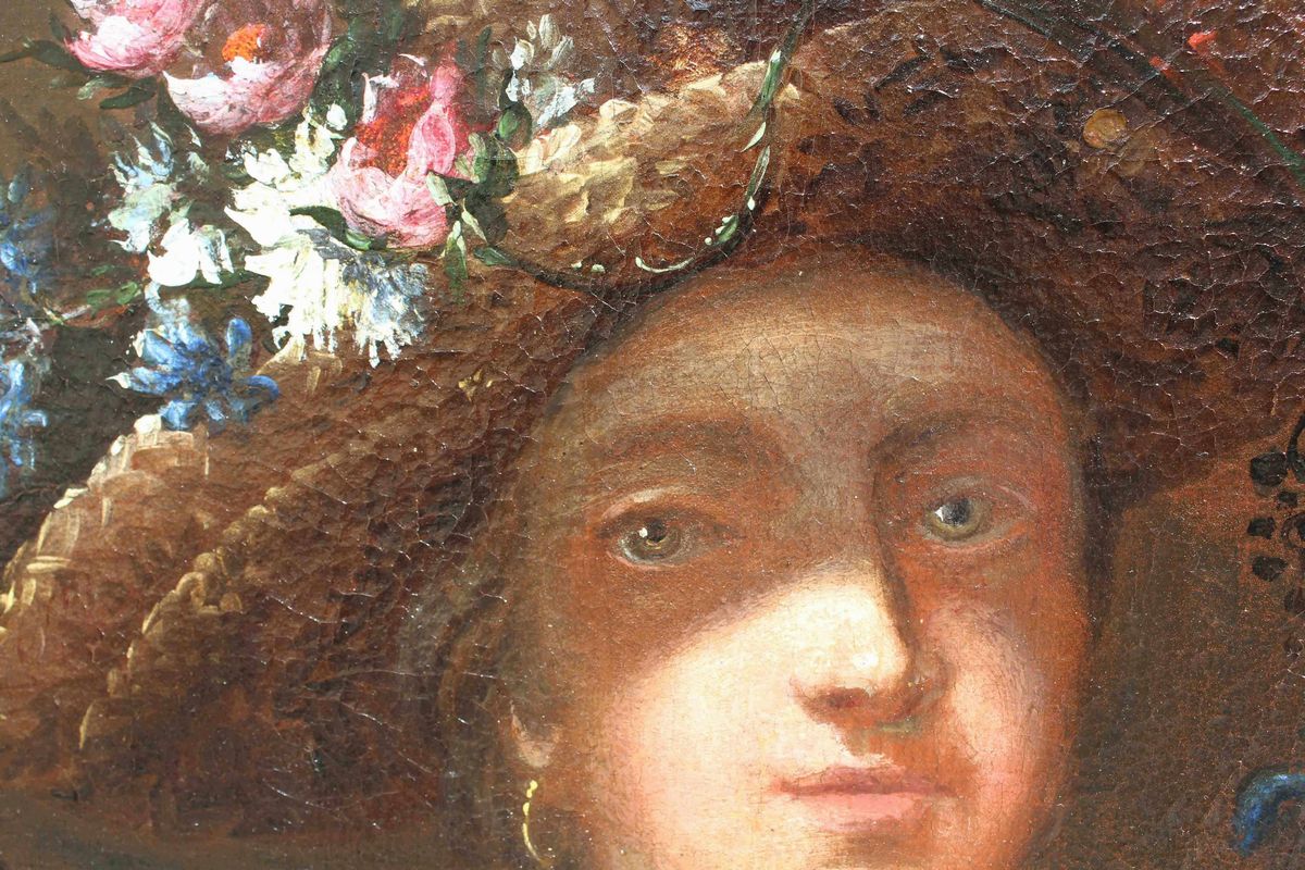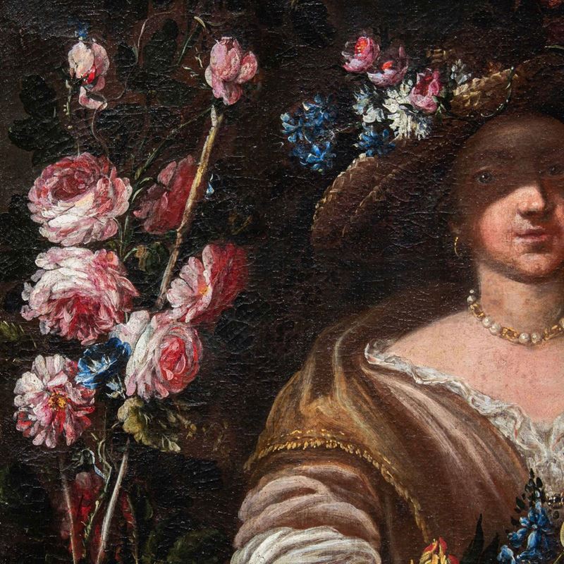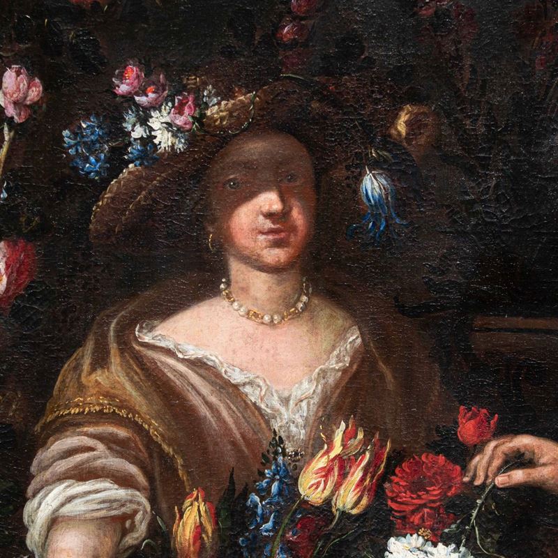 Nella natura morta qui analizzata due donne sorreggono una cesta e una variopinta ghirlanda di fiori che arriva a decorare anche la statua di un satiro collocata su un’elegante balaustra. Una delle donne si sporge dal parapetto allungando delicatamente la mano nel gesto di cogliere un candido garofano, mentre l’altra sorregge la cesta, osservando complice lo spettatore. Entrambe appaiono riccamente abbigliate ed impreziosite da parure di perle ed ampi cappelli, anch’essi decorati con vivaci composizioni di fiori. Colpisce la dettagliata e minuziosa descrizione delle diverse specie florali illuminate da vividi colpi di luce.