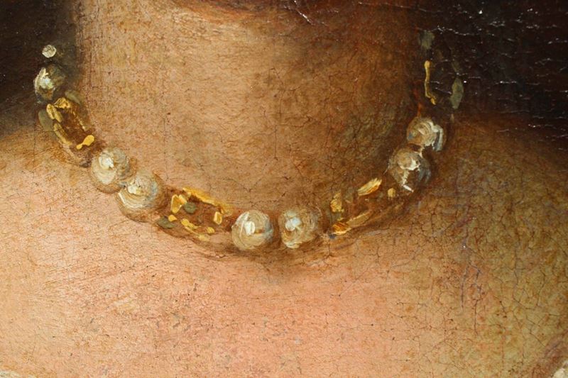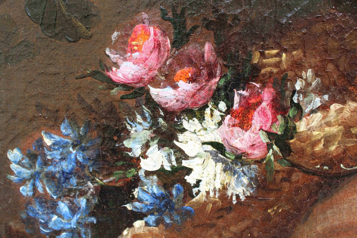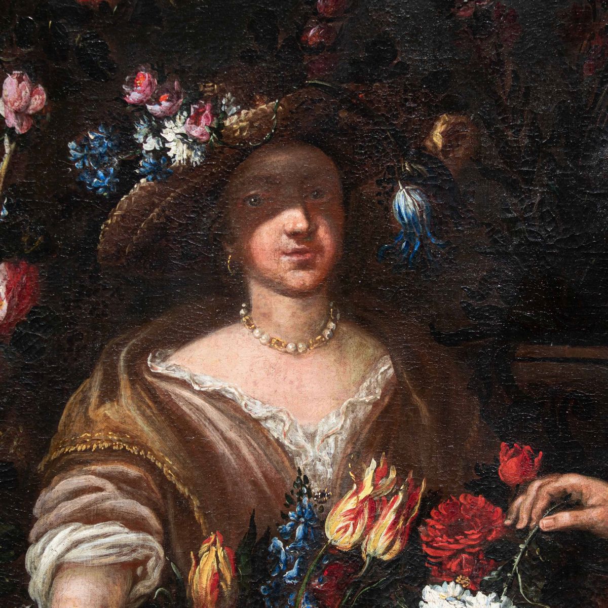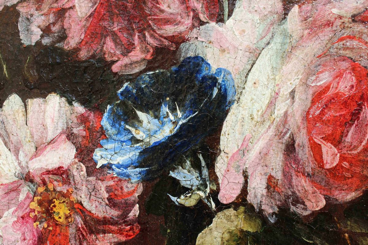 Nella natura morta qui analizzata due donne sorreggono una cesta e una variopinta ghirlanda di fiori che arriva a decorare anche la statua di un satiro collocata su un’elegante balaustra. Una delle donne si sporge dal parapetto allungando delicatamente la mano nel gesto di cogliere un candido garofano, mentre l’altra sorregge la cesta, osservando complice lo spettatore. Entrambe appaiono riccamente abbigliate ed impreziosite da parure di perle ed ampi cappelli, anch’essi decorati con vivaci composizioni di fiori. Colpisce la dettagliata e minuziosa descrizione delle diverse specie florali illuminate da vividi colpi di luce.
