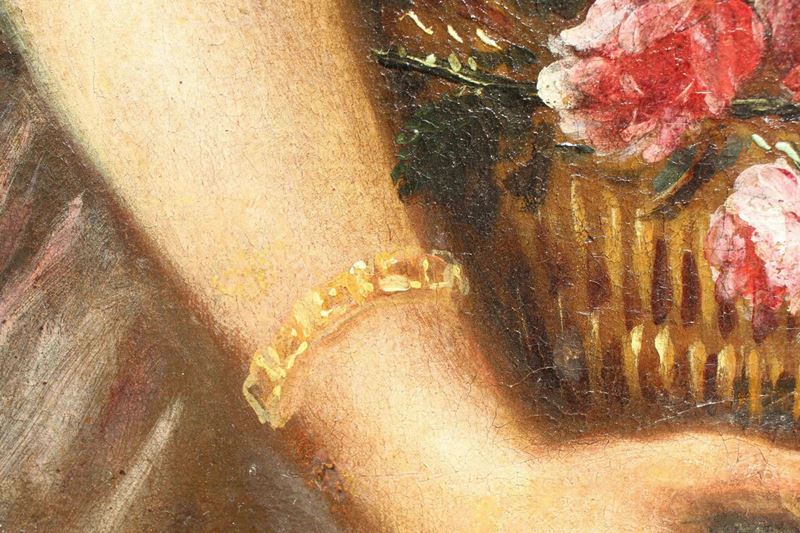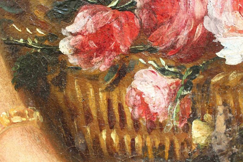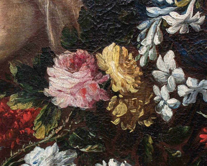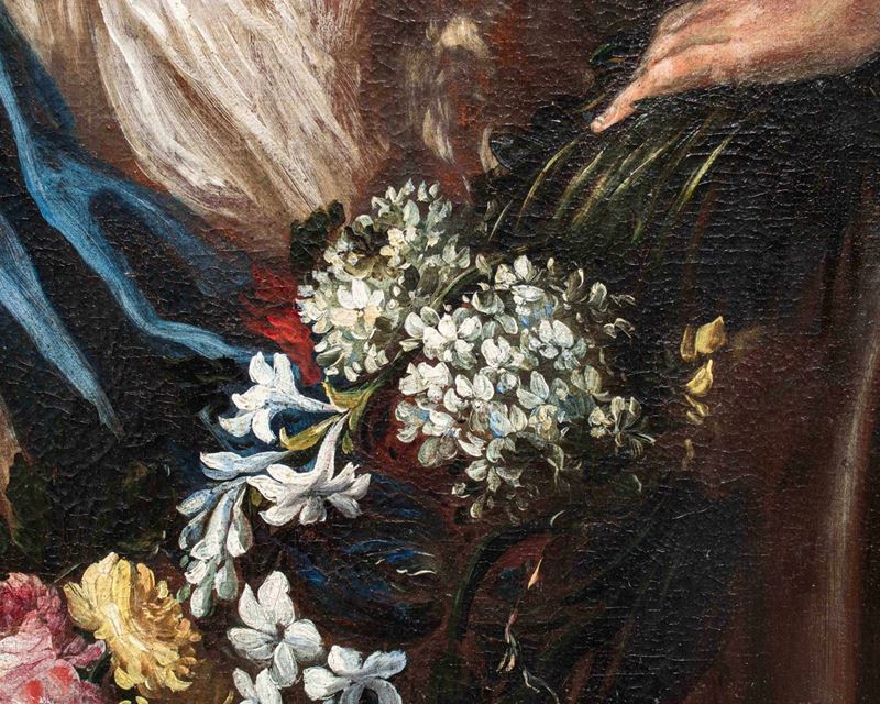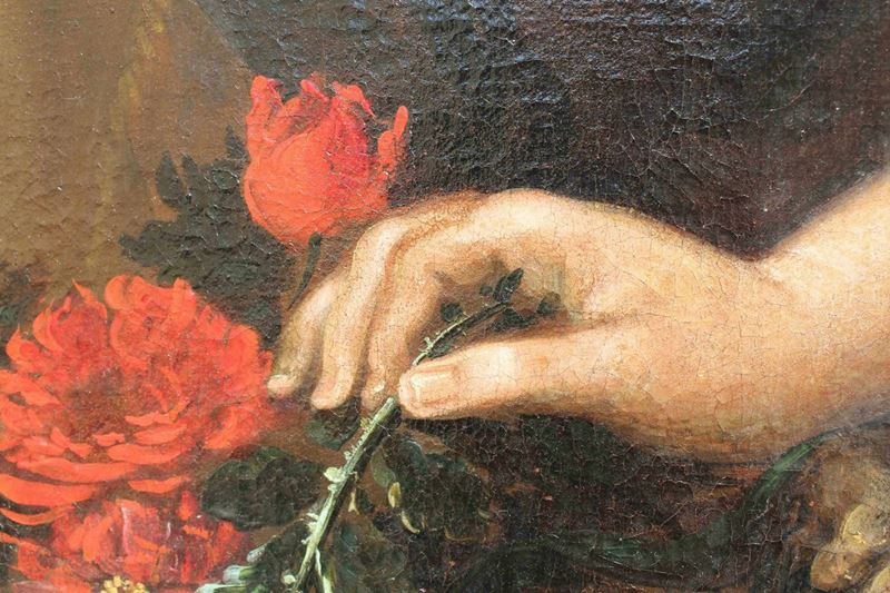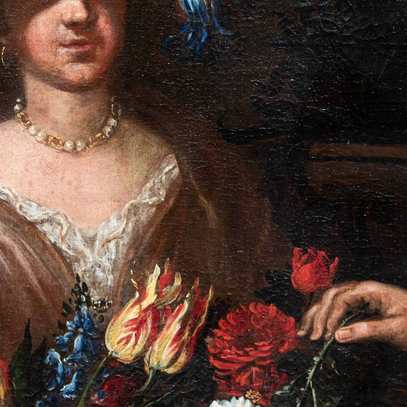 La raffinata composizione raffigurante una natura morta floreale con due donne è attribuibile per caratteristiche stilistiche e formali al pittore emiliano Felice Boselli (Piacenza, 1650 – Parma, 1732). Formatosi nella bottega di Michelangelo Nuvolone, in un ambiente fervido e stimolante, il Boselli fu attivo soprattutto nella sua città natale, Piacenza, e a Parma, dove nel 1680-87 eseguì tempere ed affreschi per il palazzo dei conti Sanvitale di Fontanellato, dei quali fu pittore di corte fin oltre il 1710. Artista poliedrico, il Boselli si cimentò, oltre che in nature morte, in ritratti, affreschi a carattere religioso (realizzati nel 1702 per la chiesa di Santa Brigida a Piacenza e ben esemplificati dall’Ecce Homo a sfondo sacro) e in scene mitologiche.