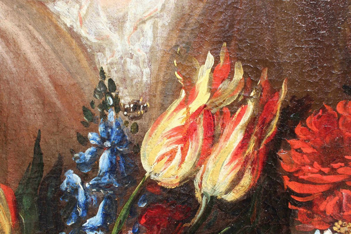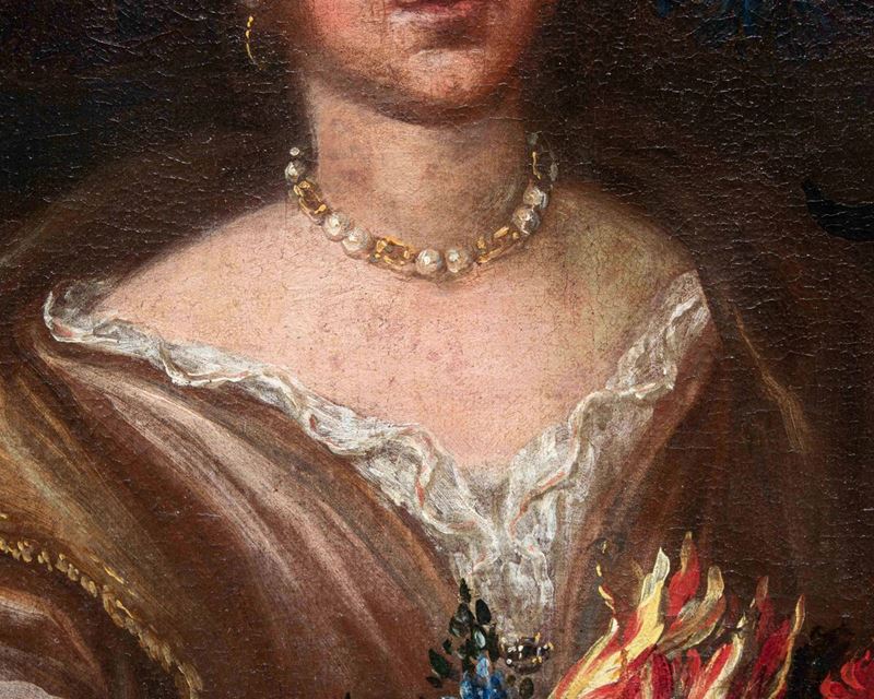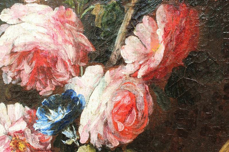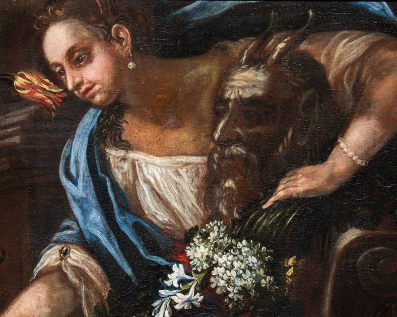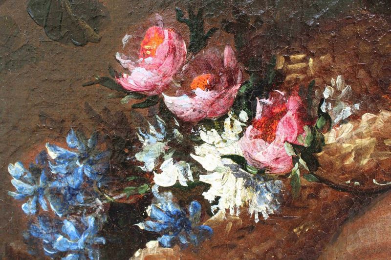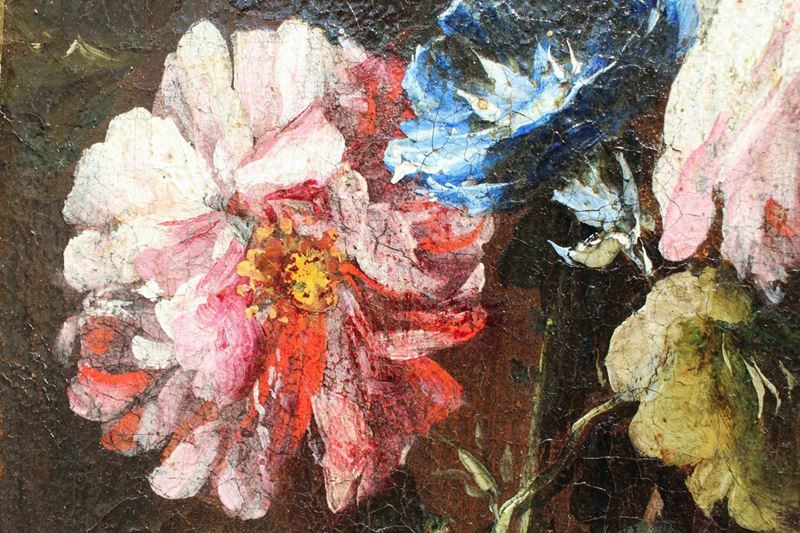 La raffinata composizione raffigurante una natura morta floreale con due donne è attribuibile per caratteristiche stilistiche e formali al pittore emiliano Felice Boselli (Piacenza, 1650 – Parma, 1732). Formatosi nella bottega di Michelangelo Nuvolone, in un ambiente fervido e stimolante, il Boselli fu attivo soprattutto nella sua città natale, Piacenza, e a Parma, dove nel 1680-87 eseguì tempere ed affreschi per il palazzo dei conti Sanvitale di Fontanellato, dei quali fu pittore di corte fin oltre il 1710. Artista poliedrico, il Boselli si cimentò, oltre che in nature morte, in ritratti, affreschi a carattere religioso (realizzati nel 1702 per la chiesa di Santa Brigida a Piacenza e ben esemplificati dall’Ecce Homo a sfondo sacro) e in scene mitologiche.