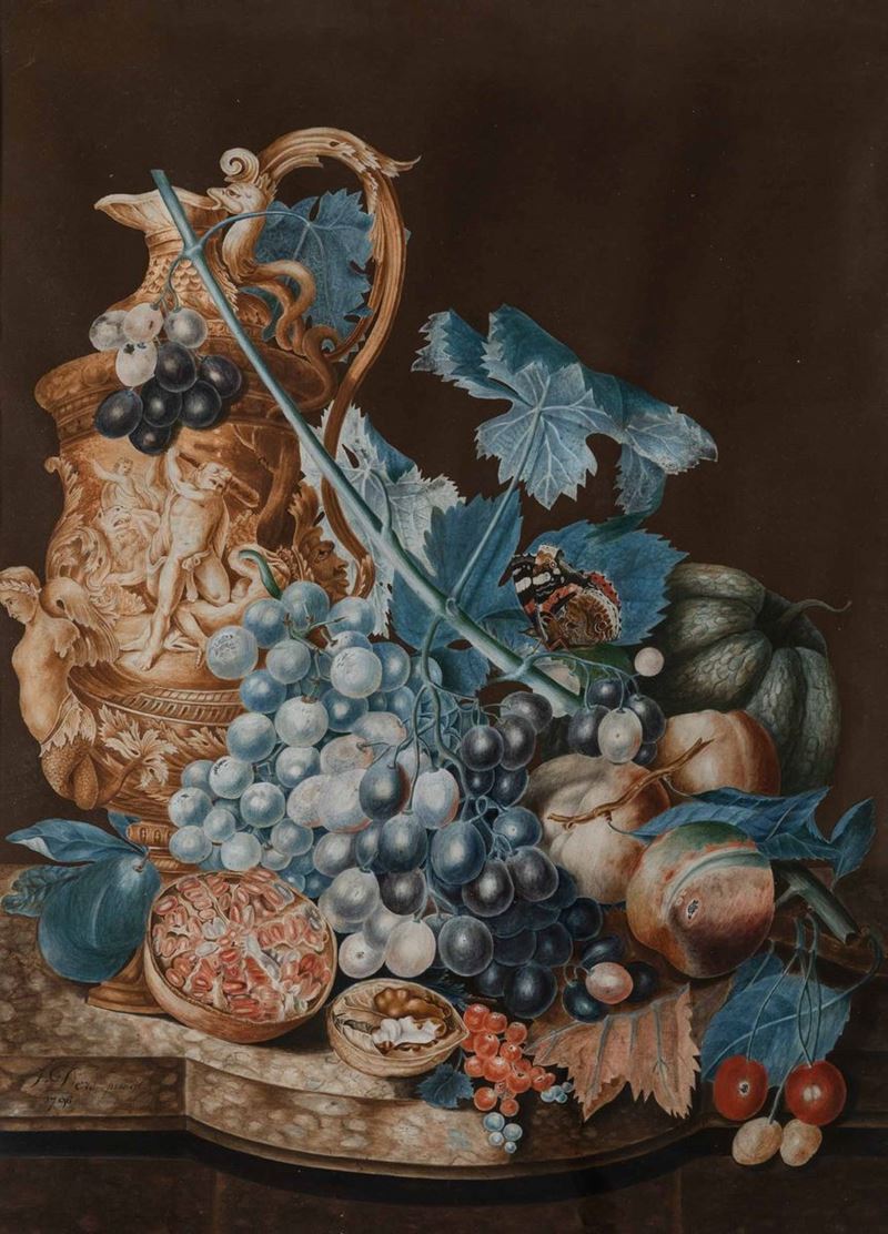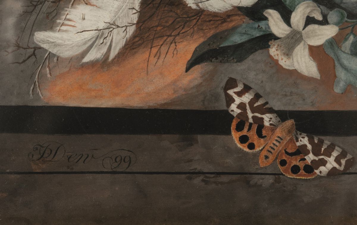 Scuola del XVIII secolo Nature morte con composizioni di fiori, frutti, uccellini e farfalle