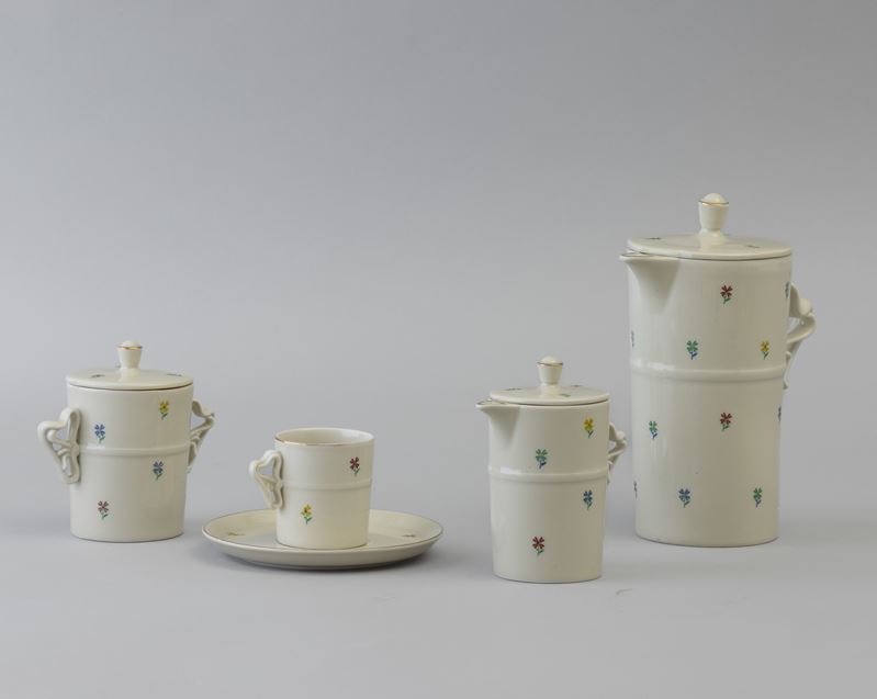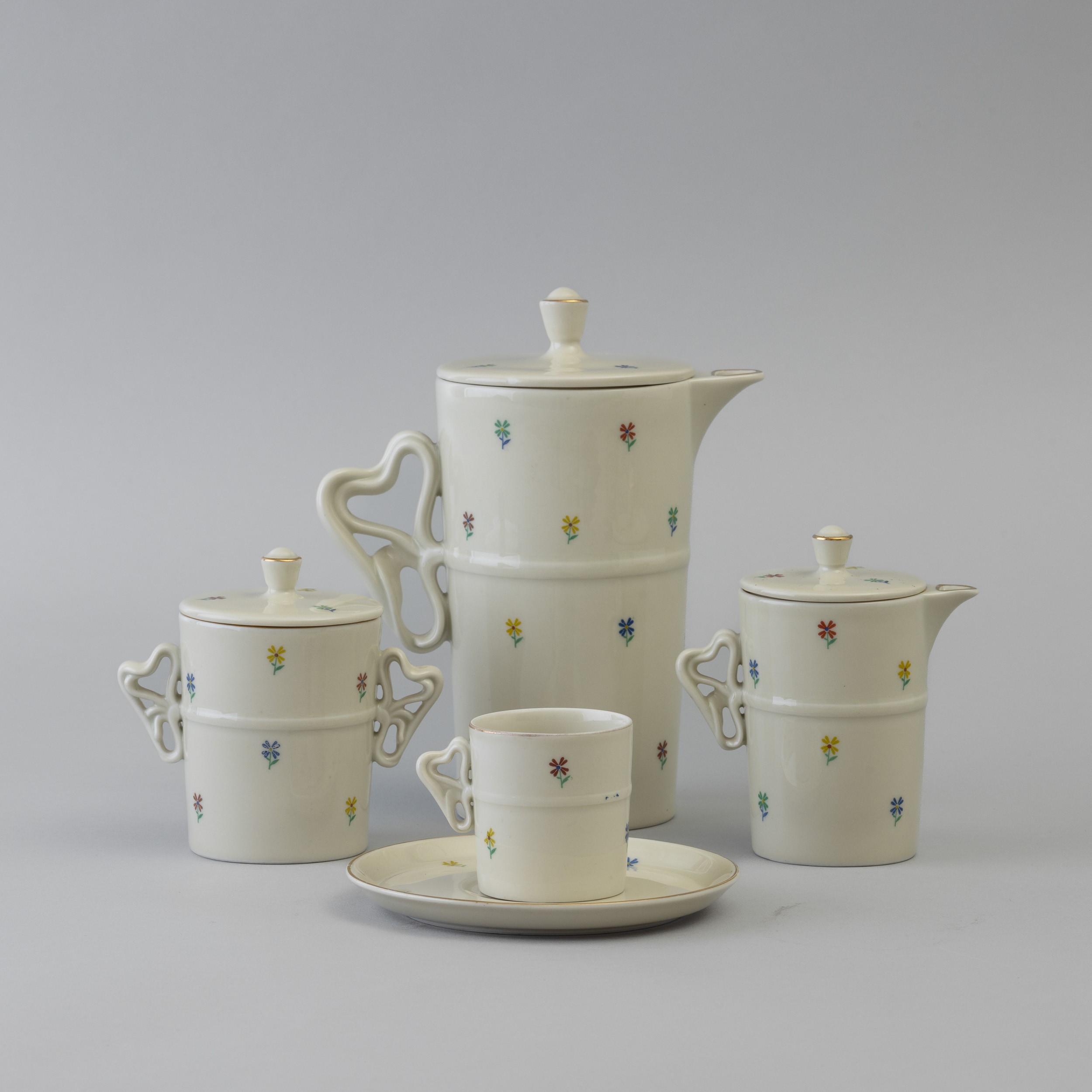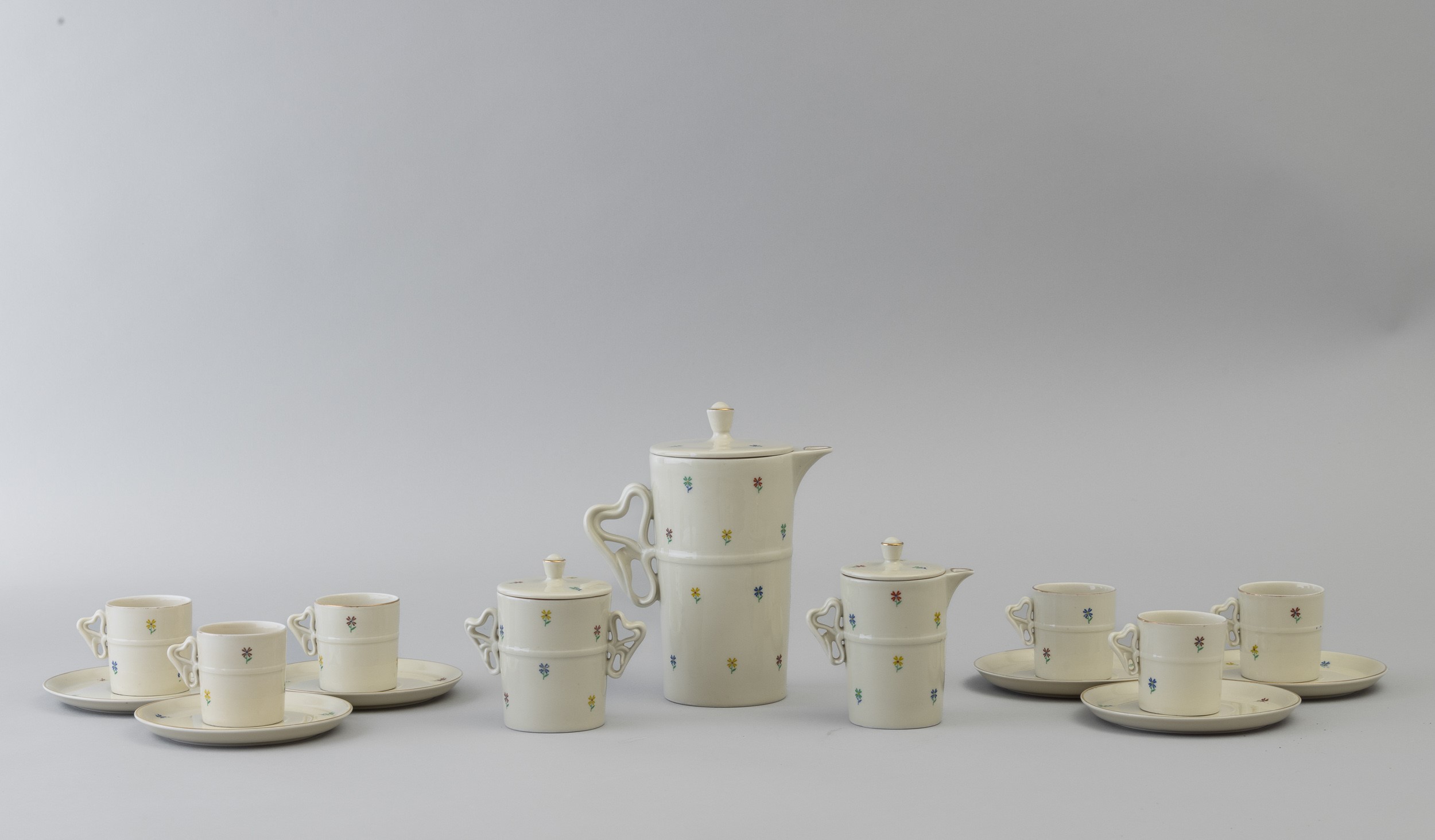 An earthenware ceramic coffee set with 6 cups and plates, 1 coffee pot, 1 milk jug, 1 sugar pot. Maker's mark