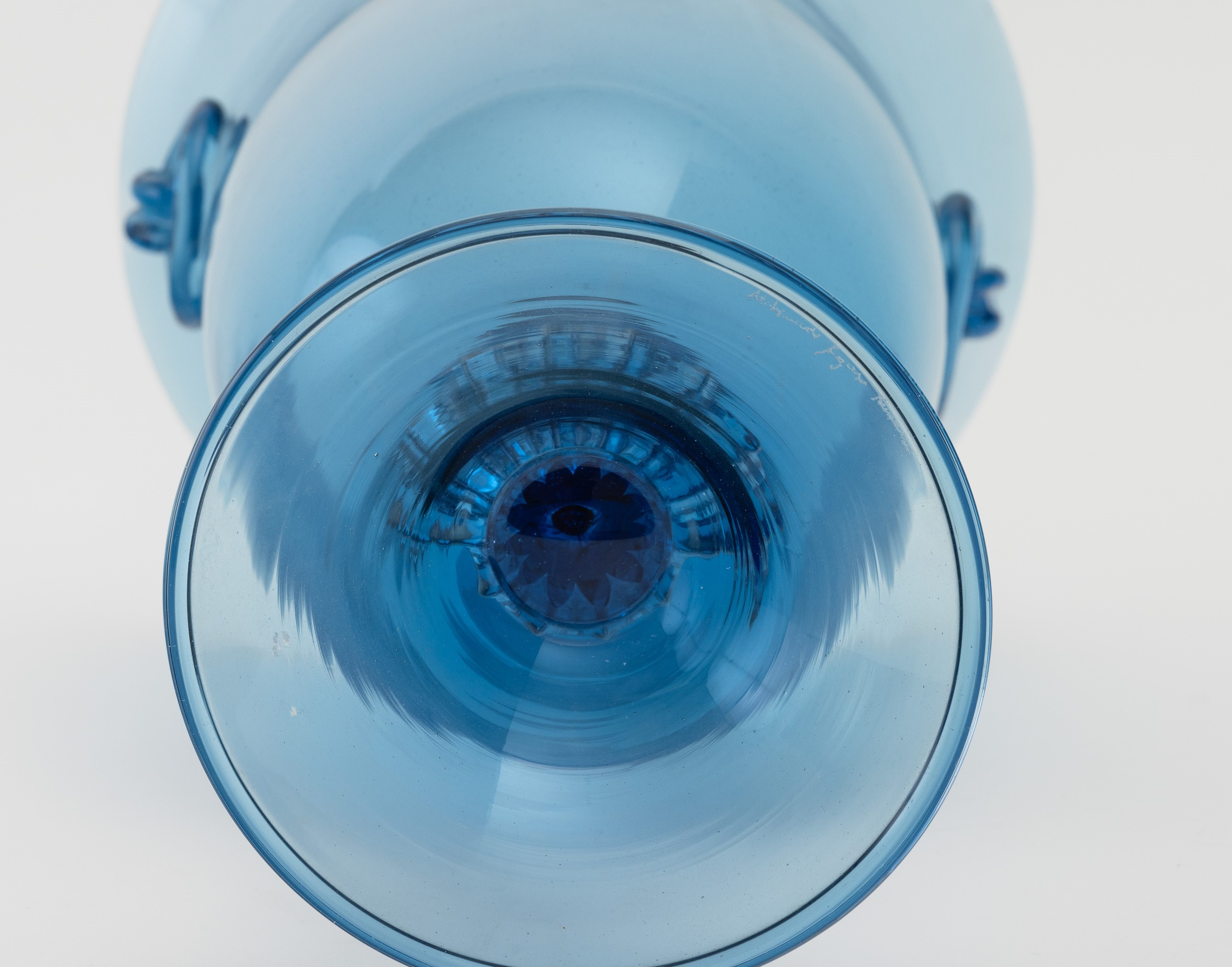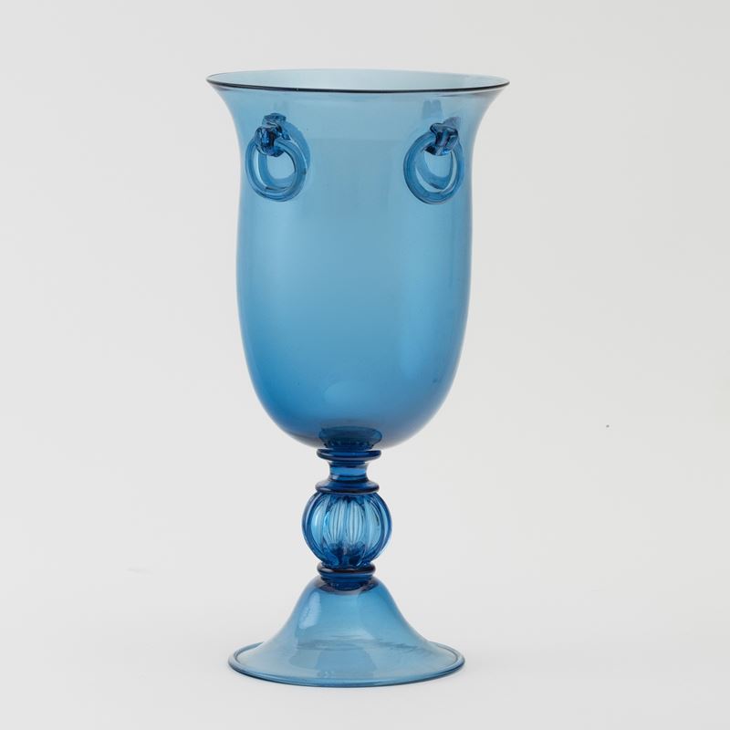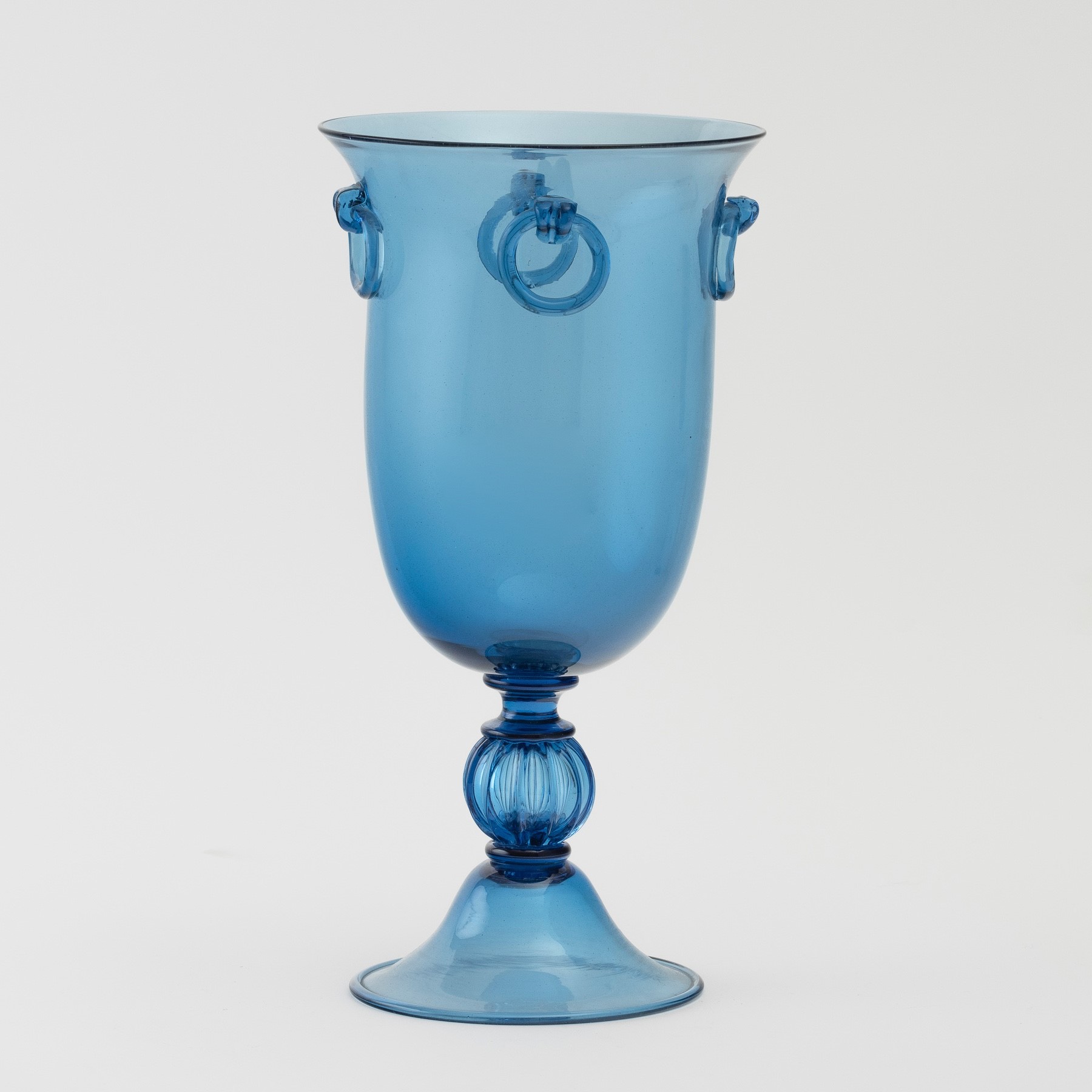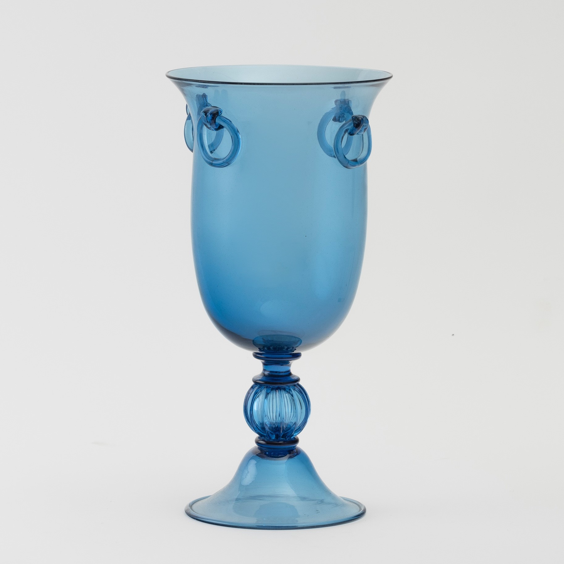 Grande coppa in vetro soffiato bluino con decoro di palla costolata. Anelli e piede a campana rovesciata applicati.