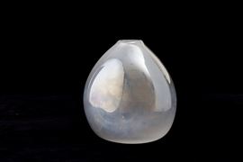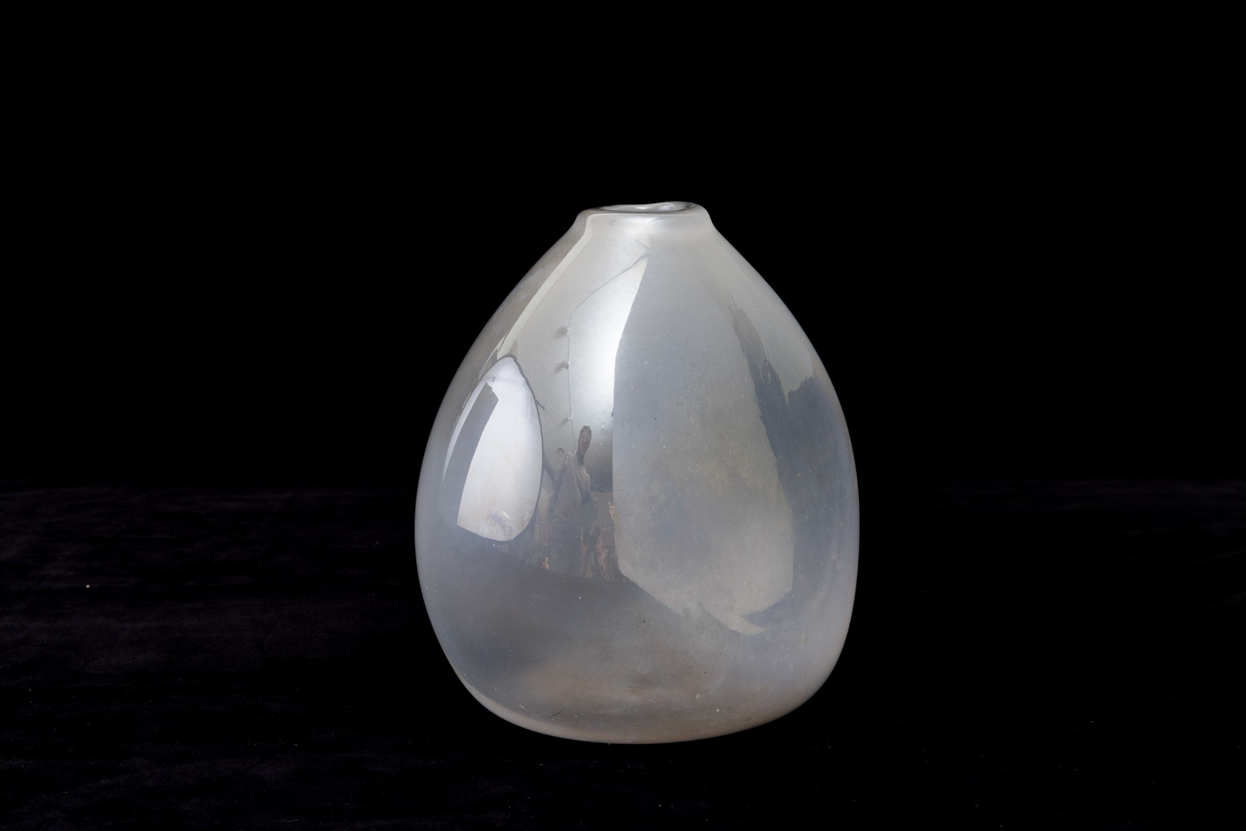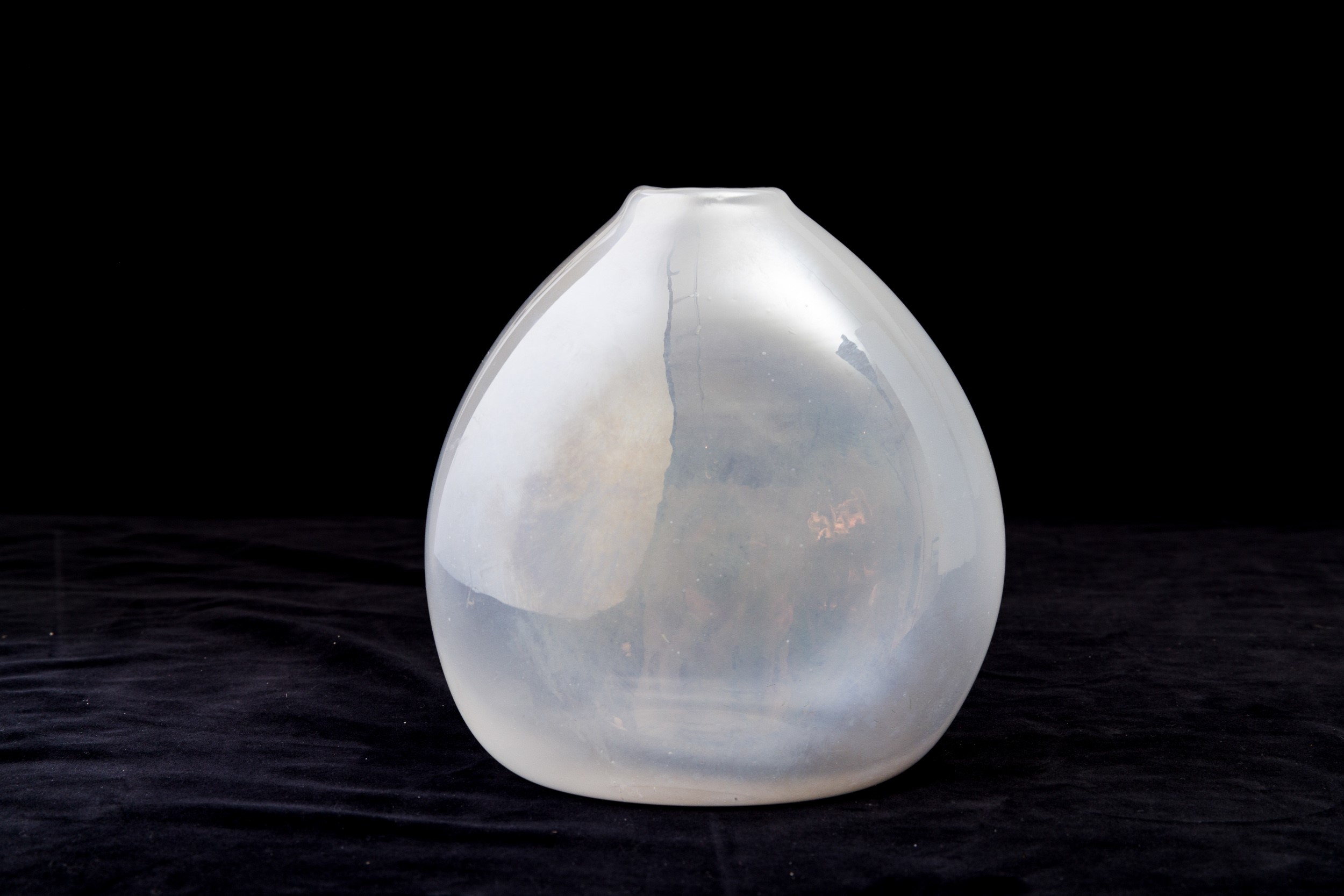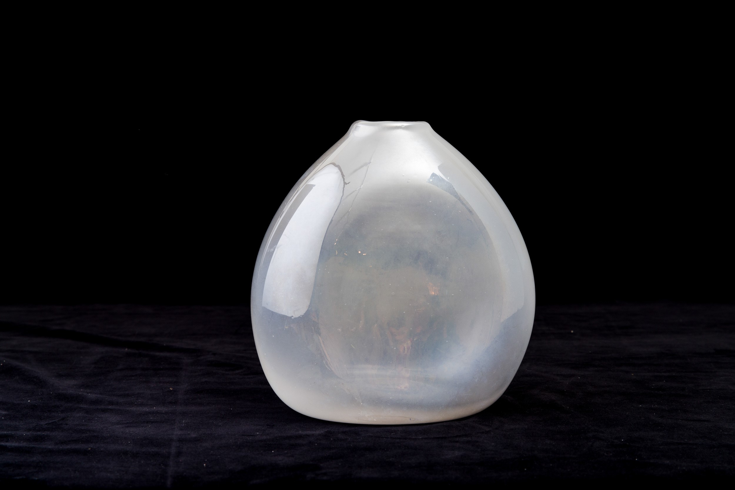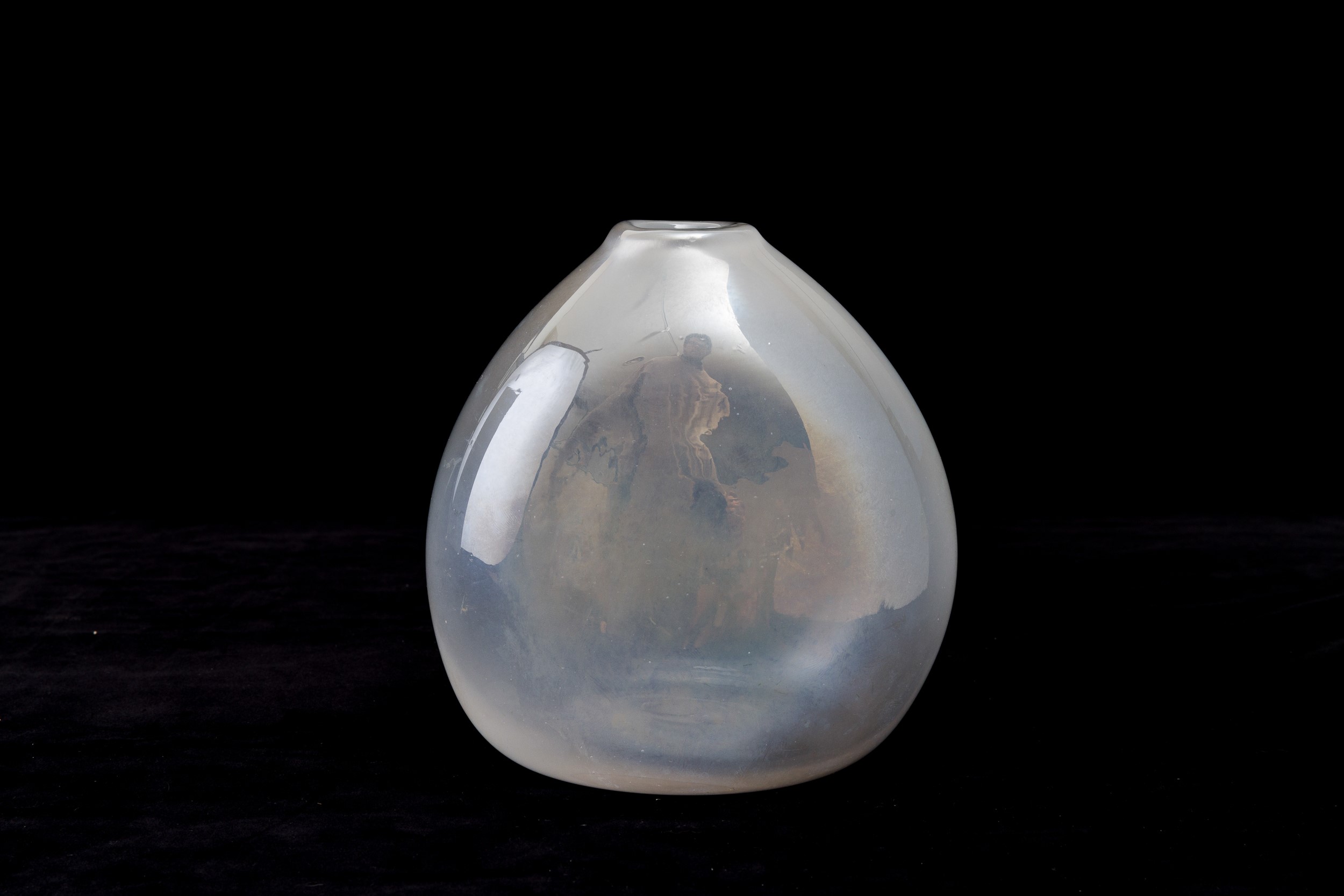 Vaso a goccia in vetro soffiato a sezione ovale con superficie fortemente iridata.
