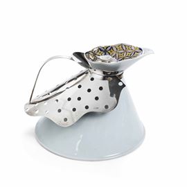 Teiera in terraglia a colaggio con decoro a smalti policromi e dorature e mantello applicato in metallo argentato.