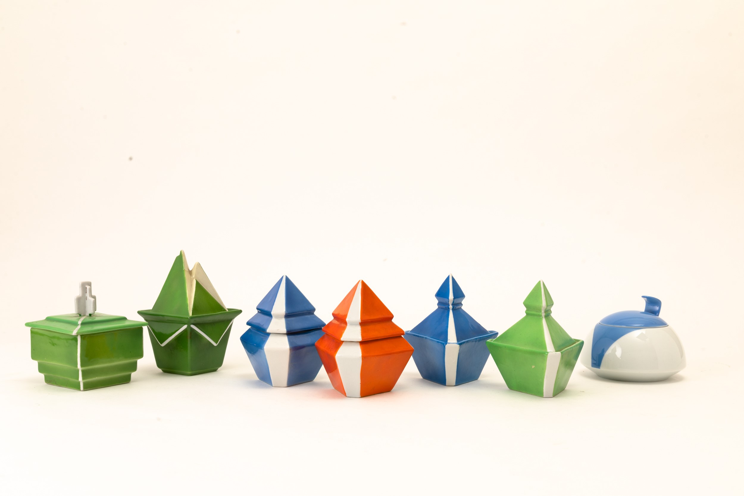 Lotto formato da sei scatoline in porcellana futuriste e una rotonda moderna.