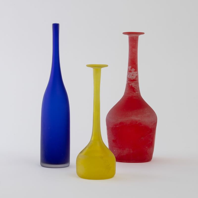 Lotto formato da tre bottiglie in vetro soffiato con lungo collo a tecnica a scavo.