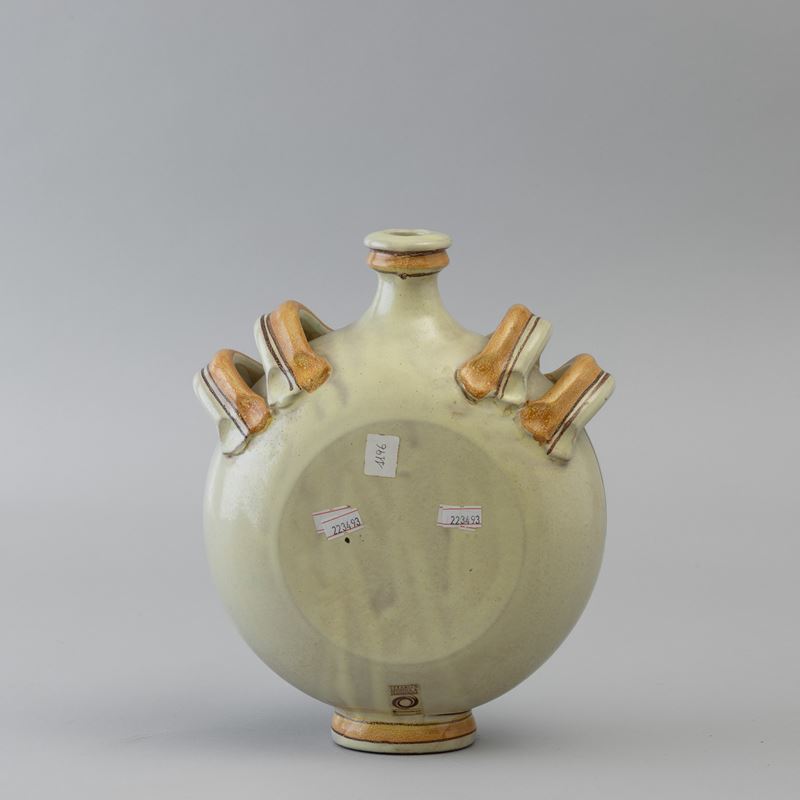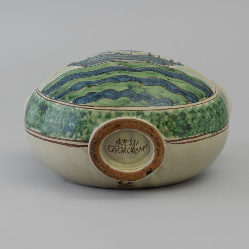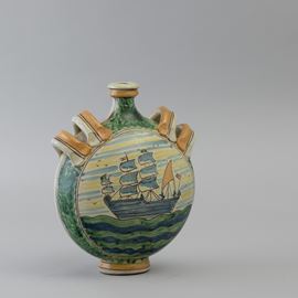 Vaso a fiasca biansata in terraglia con decoro di veliero dipinto a mano.