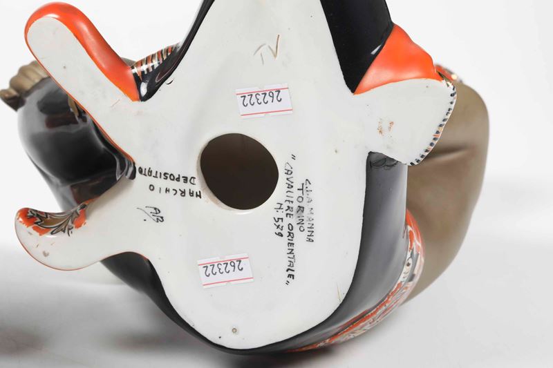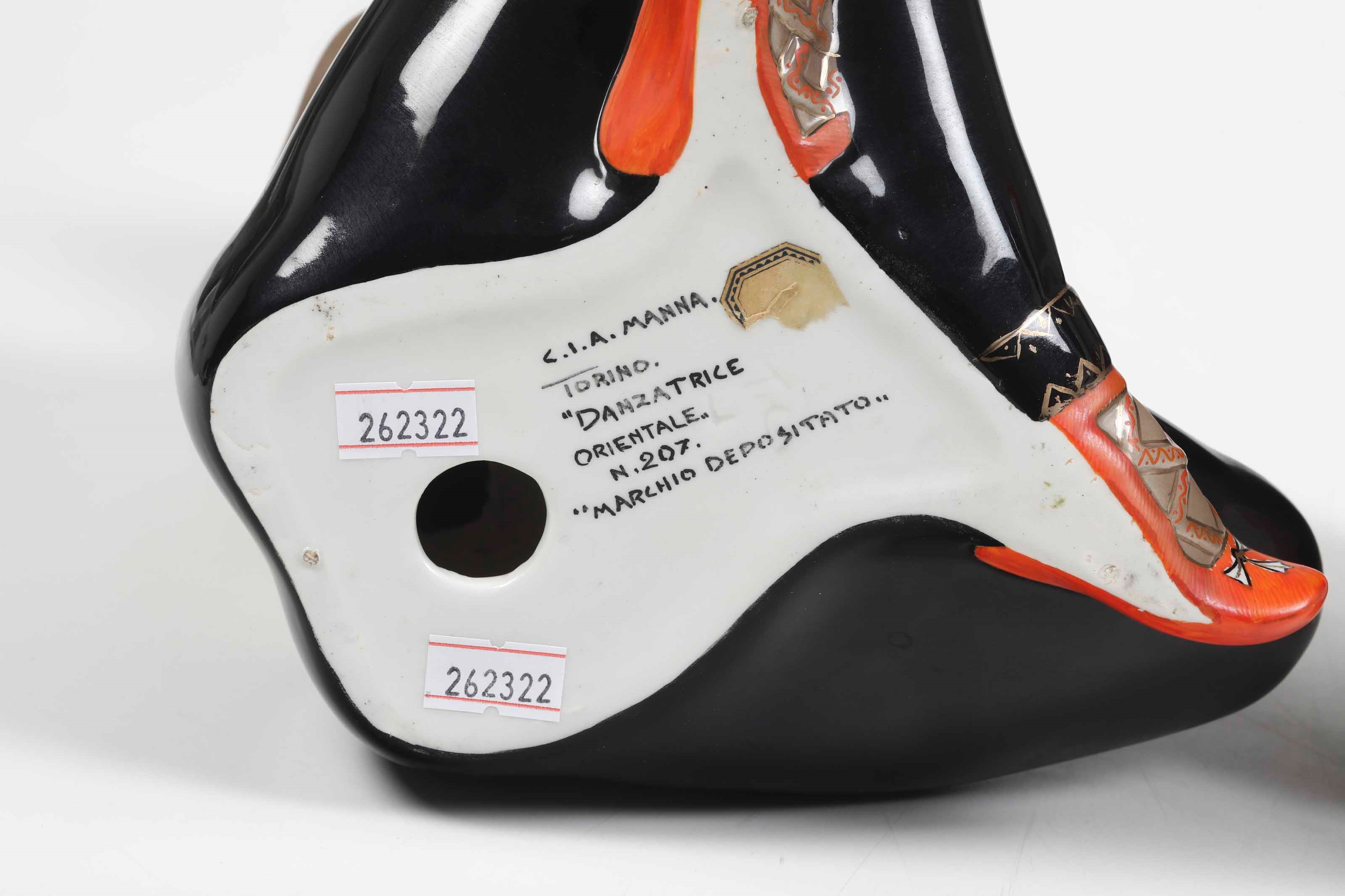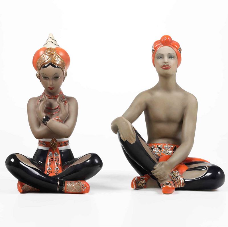 Coppia di statuette Danzatrice e Cavaliere orientale in terraglia con decoro policromo.