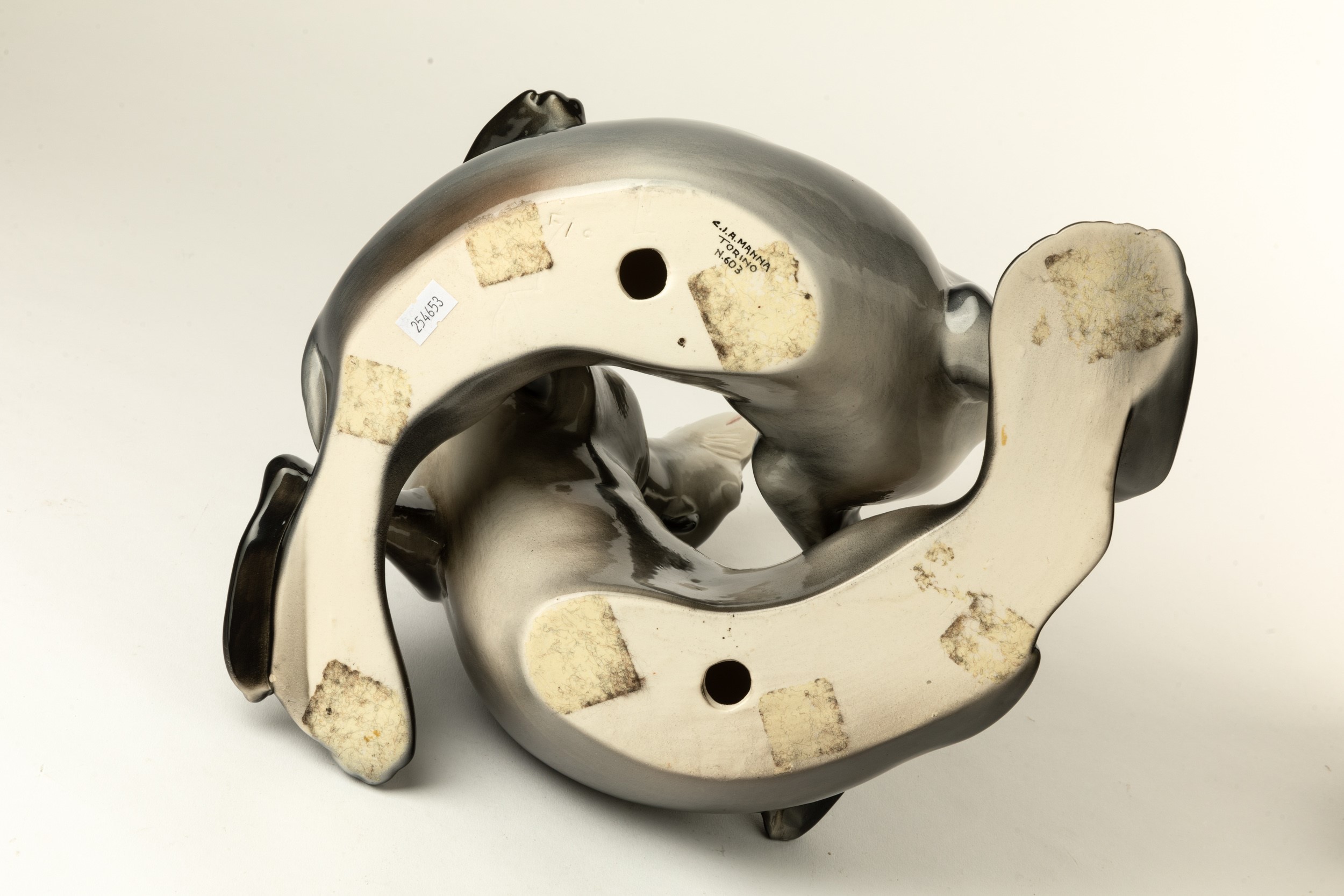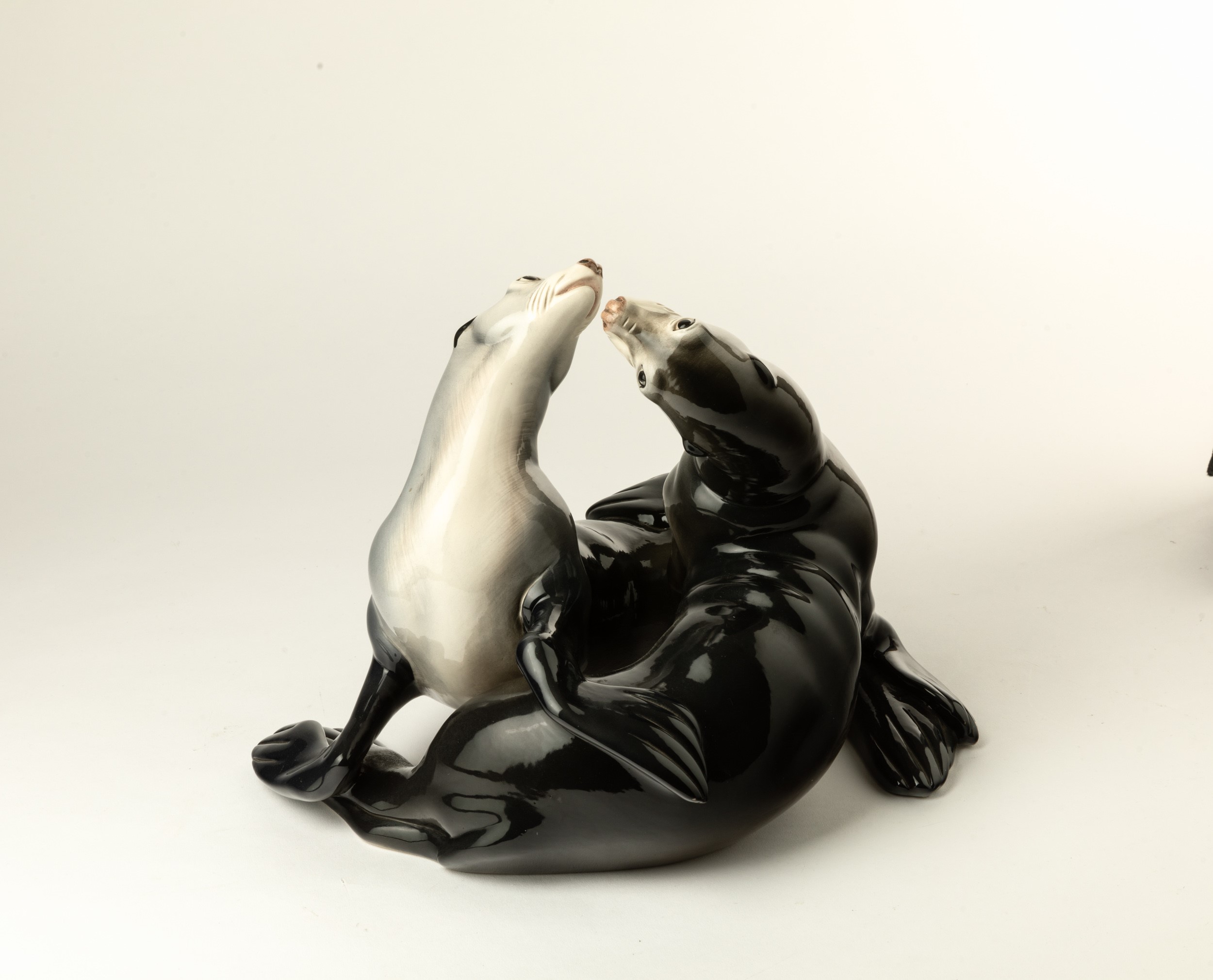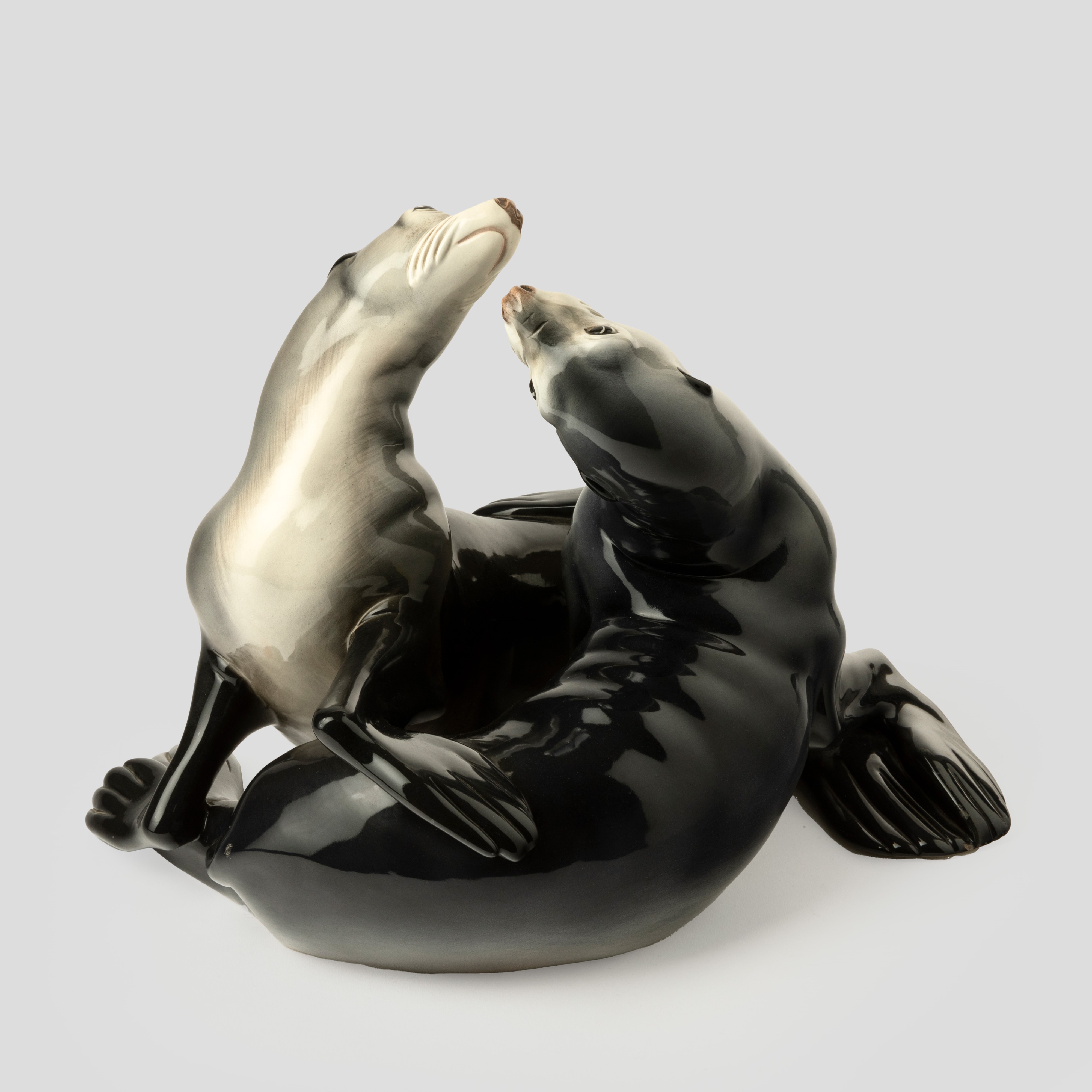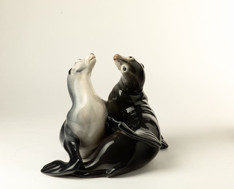 Scultura raffigurante coppia di foche in terraglia a colaggio con decoro policromo.