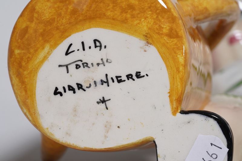 Figura di giardiniere in terraglia a colaggio con decoro policromo.