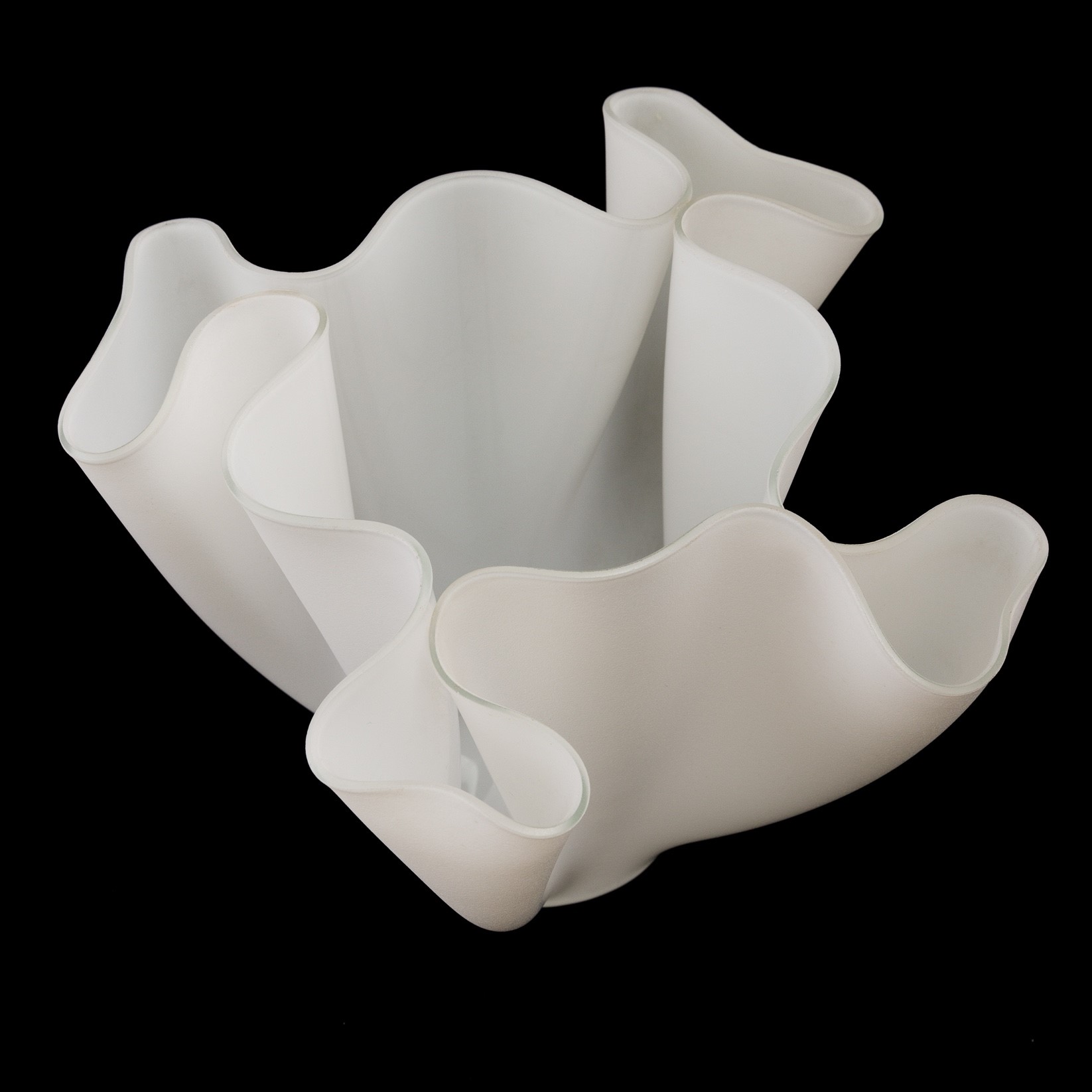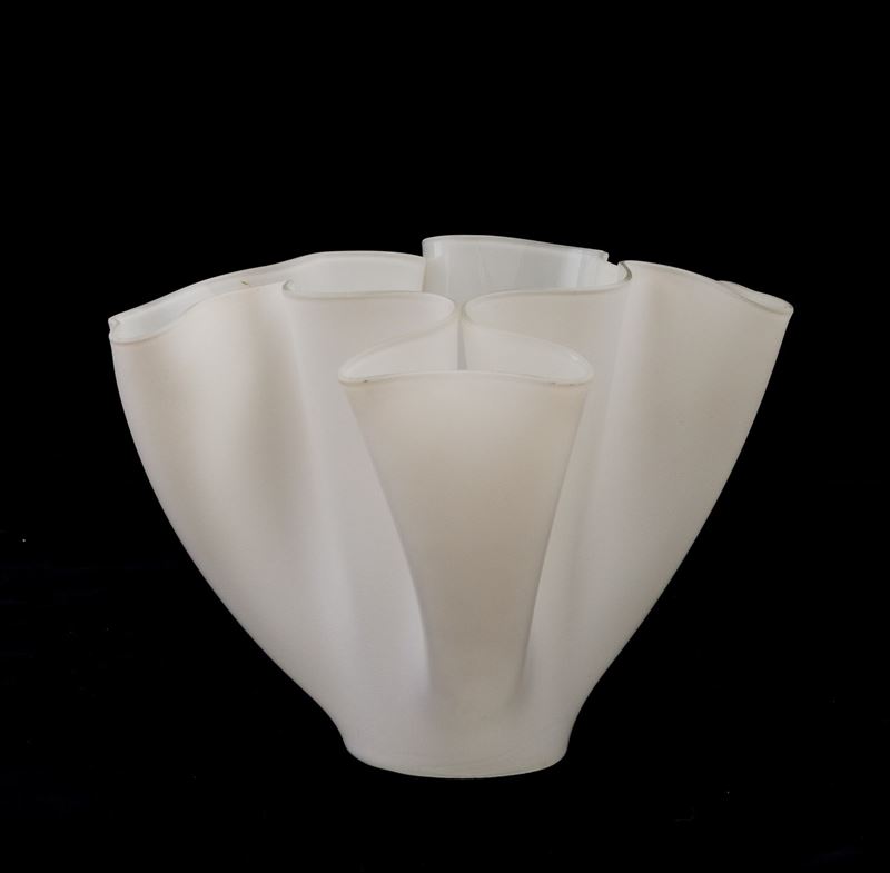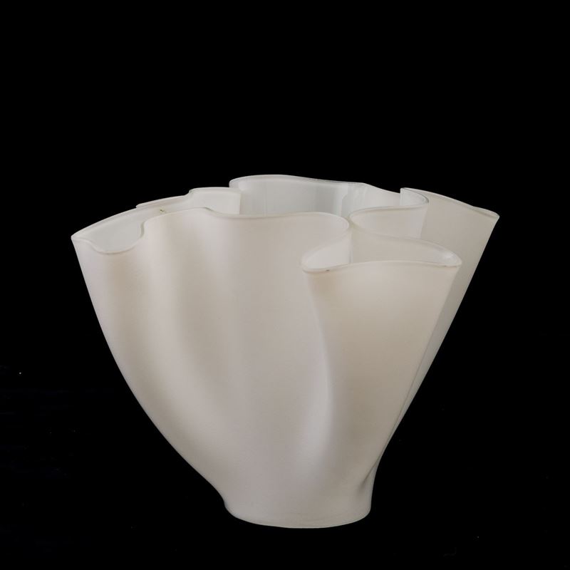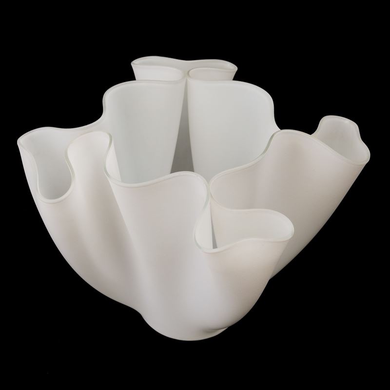 Vaso a fazzoletto formato da foglio di cristallo lavorato a caldo sabbiato.