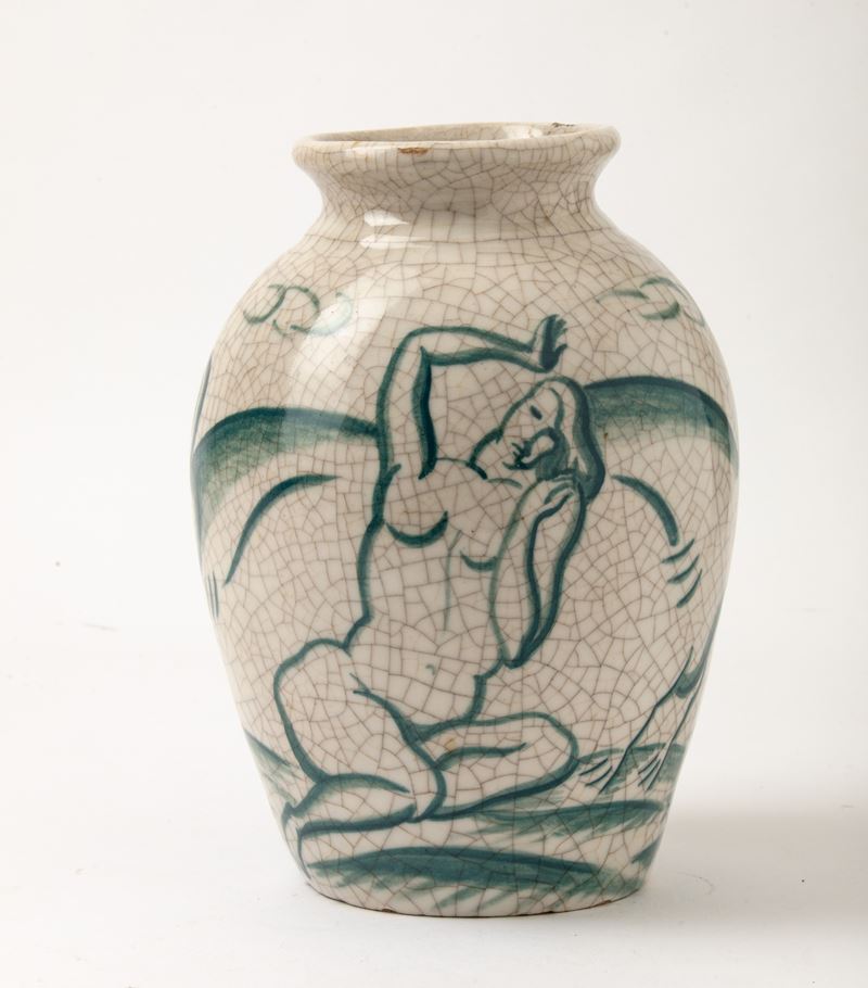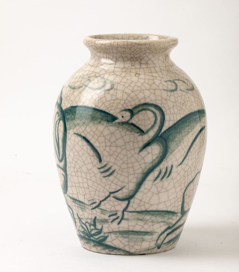 Vaso in terracotta maiolicata con decoro di Leda e il cigno, smalto craquelè.