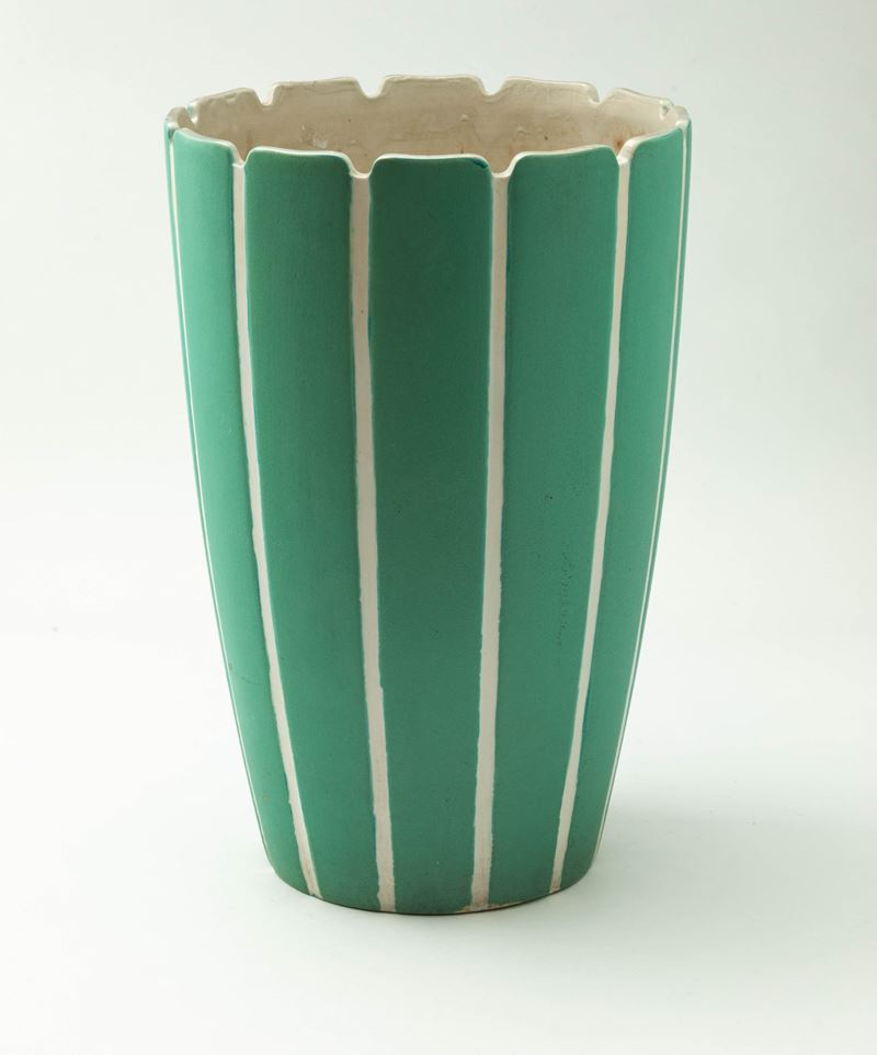 Grande vaso portaombrelli a tronco di cono con decoro a smalti bicolore e bordo frastagliato