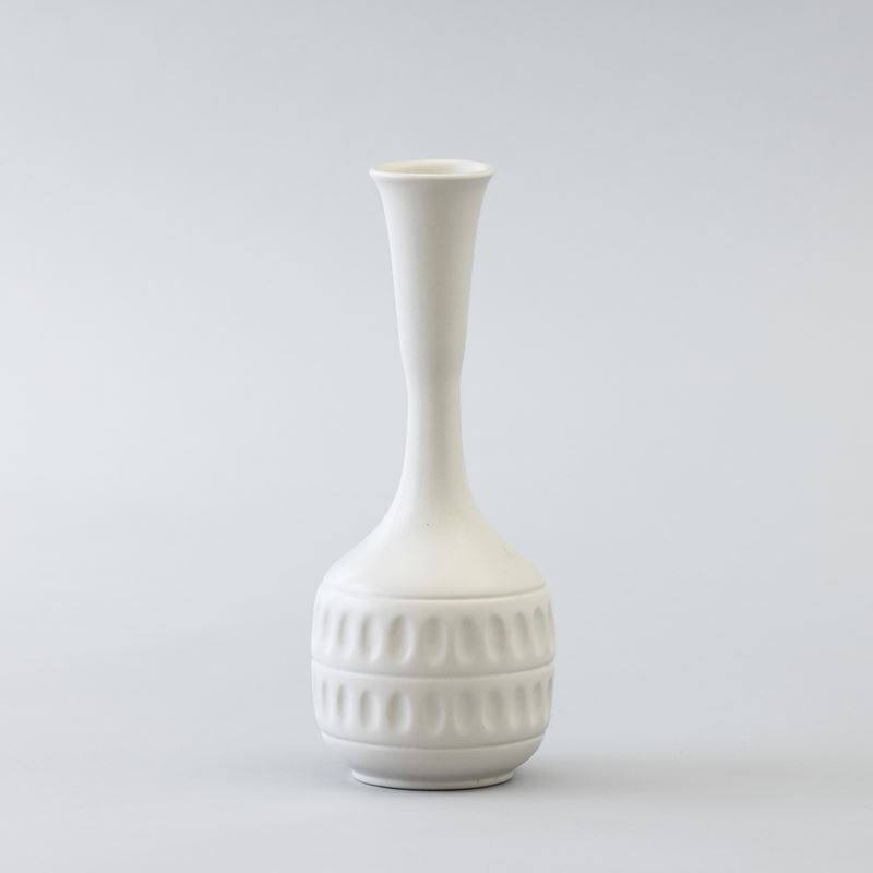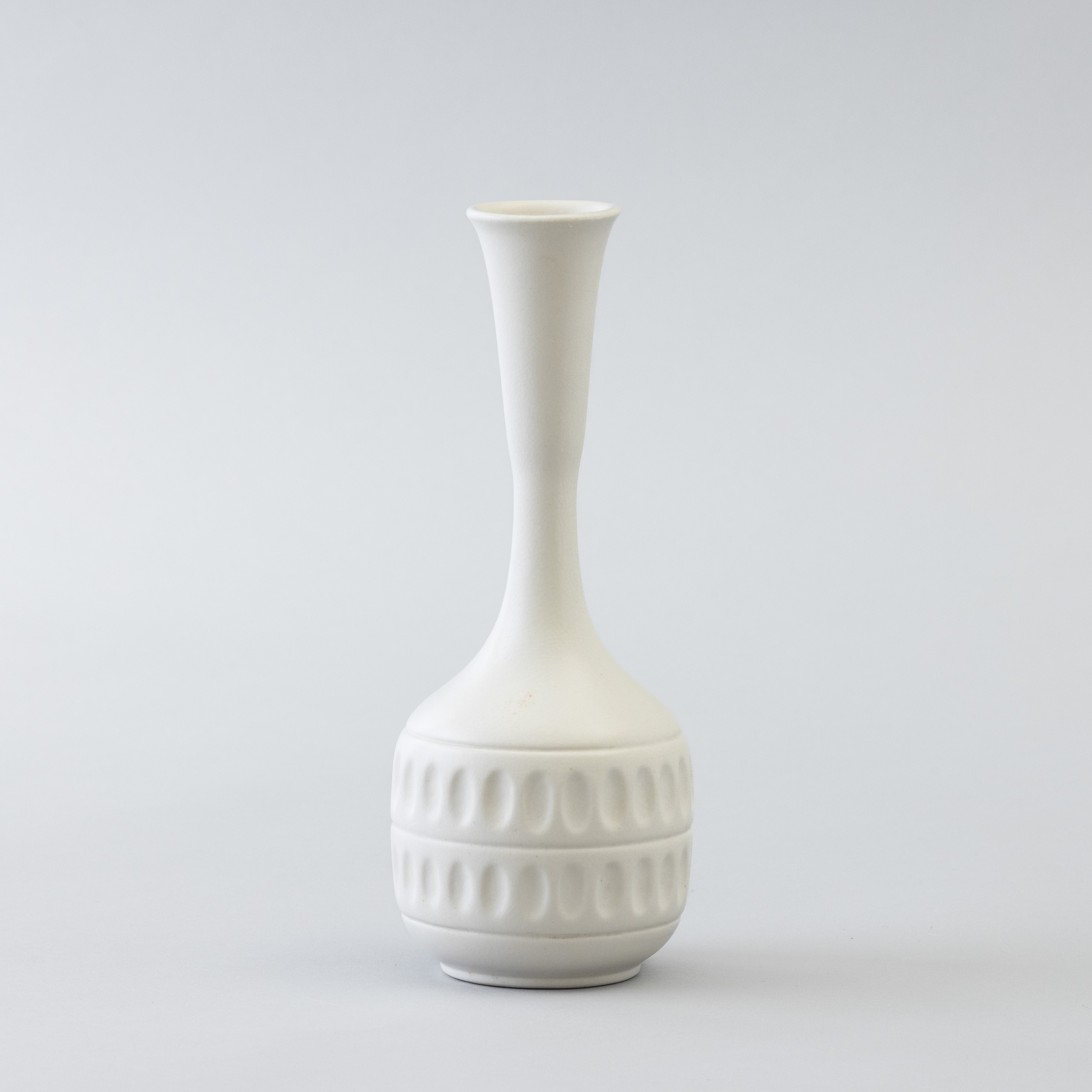 Piccolo vaso in terraglia a colaggio con decoro impresso.