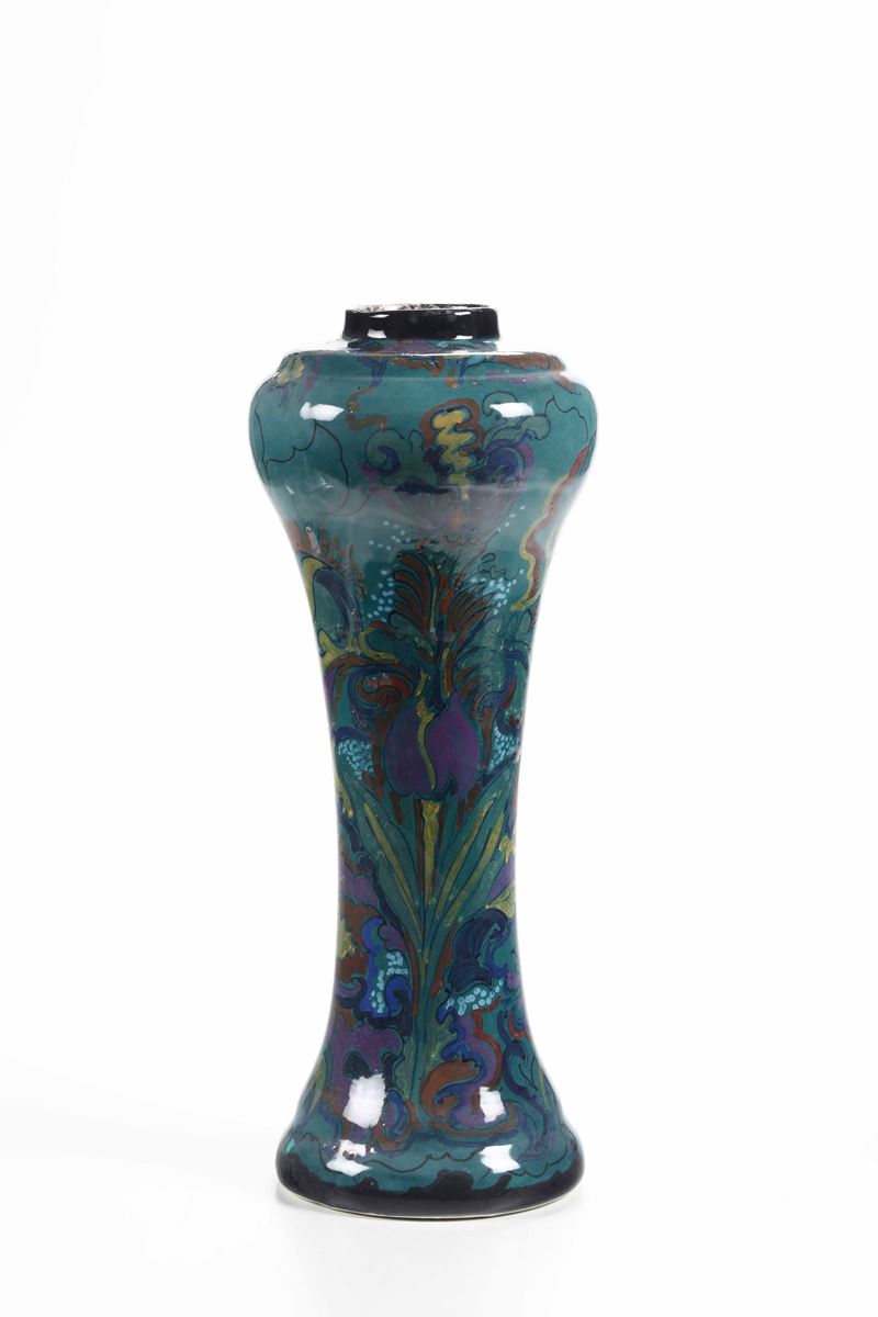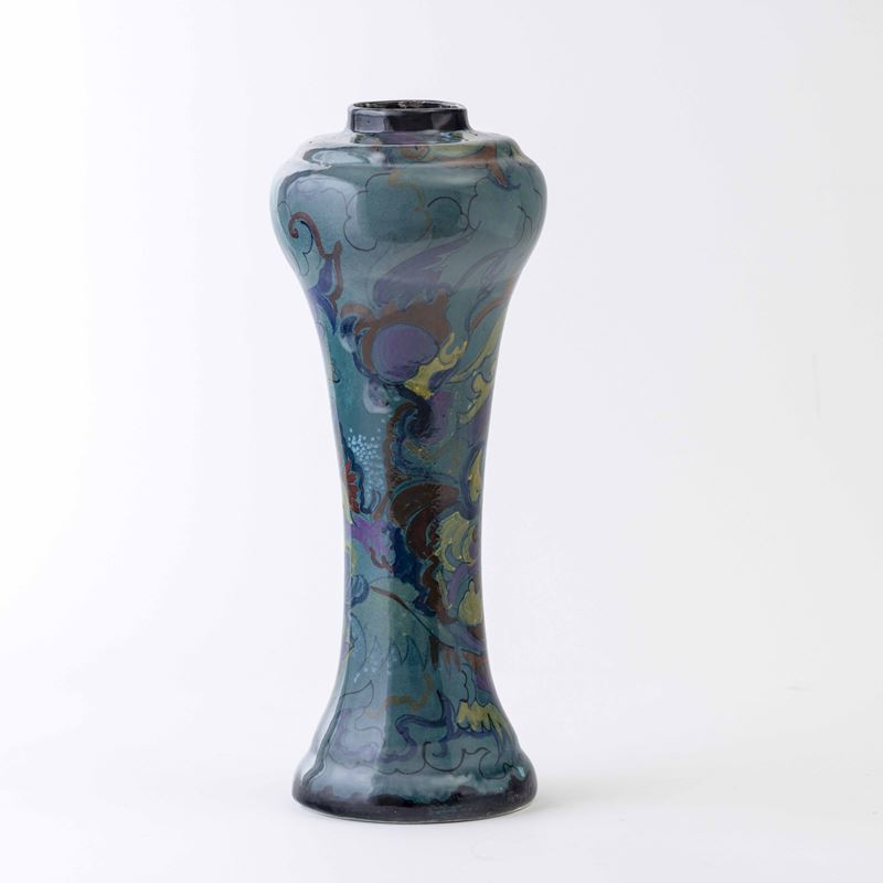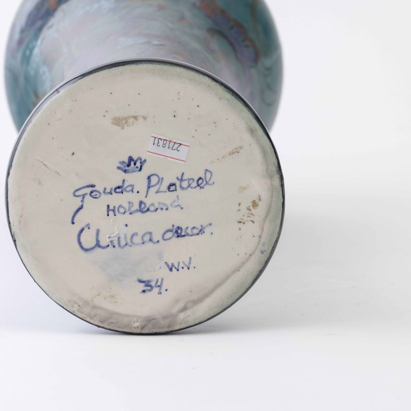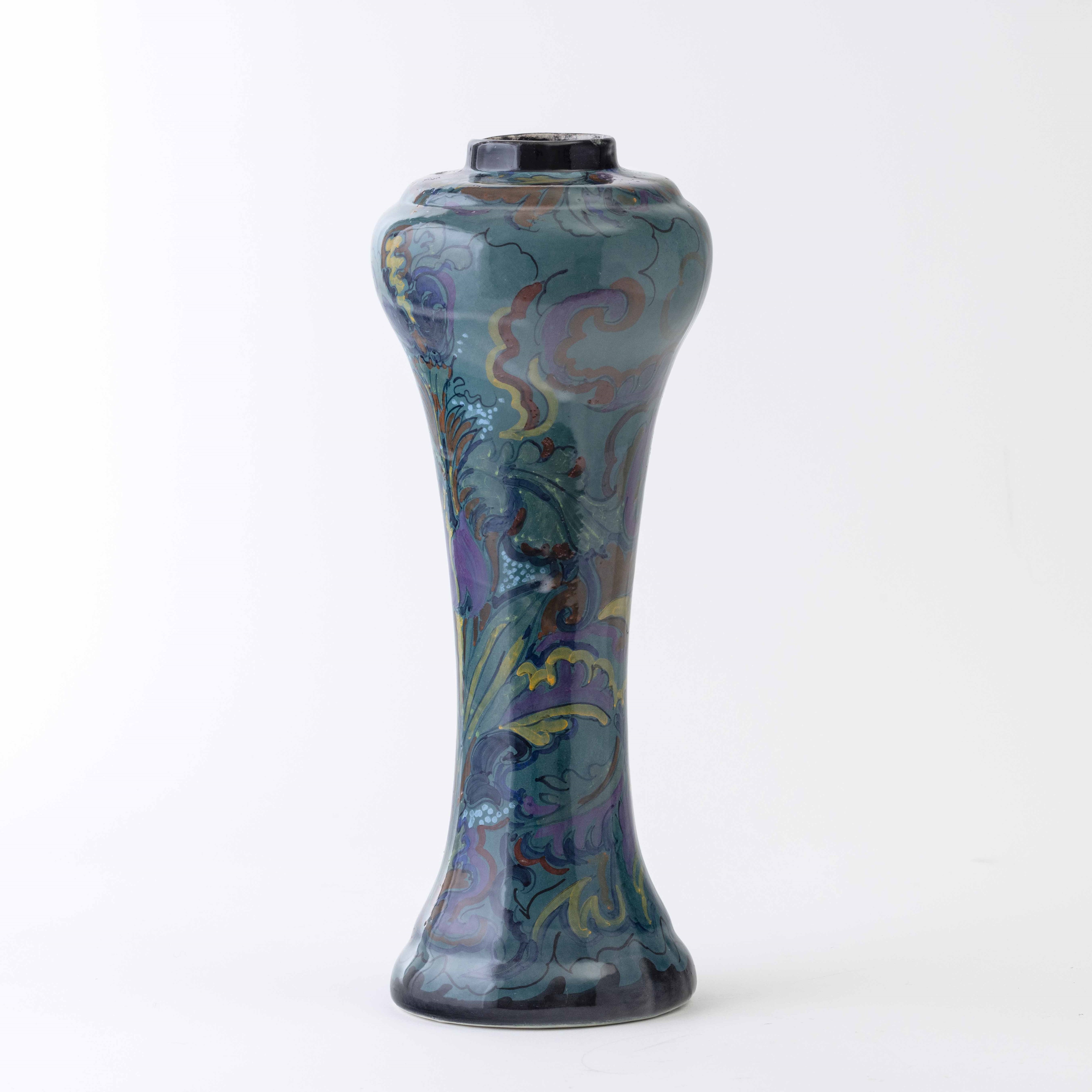 A large earthenware ceramic vase with a polychrome enamel decor. Maker's mark and V. W. Jansen