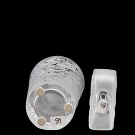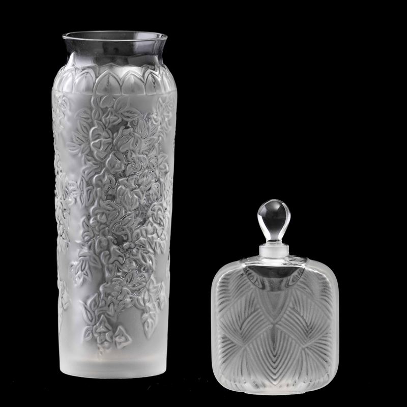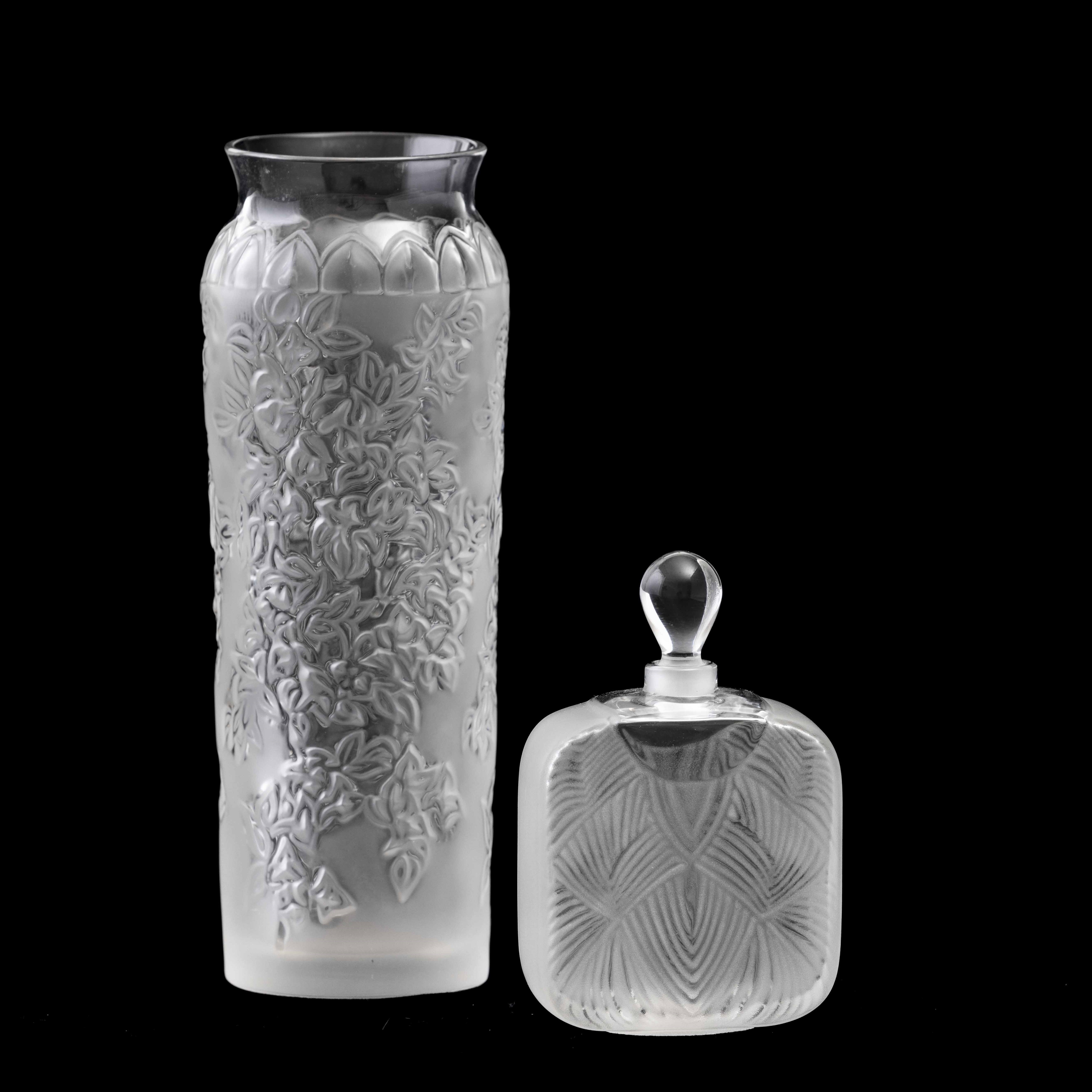 Lotto formato da vaso in cristallo stampato con decoro di foglie impresse e piccola bottiglia da profumo con decoro geometrico e tappo a goccia.