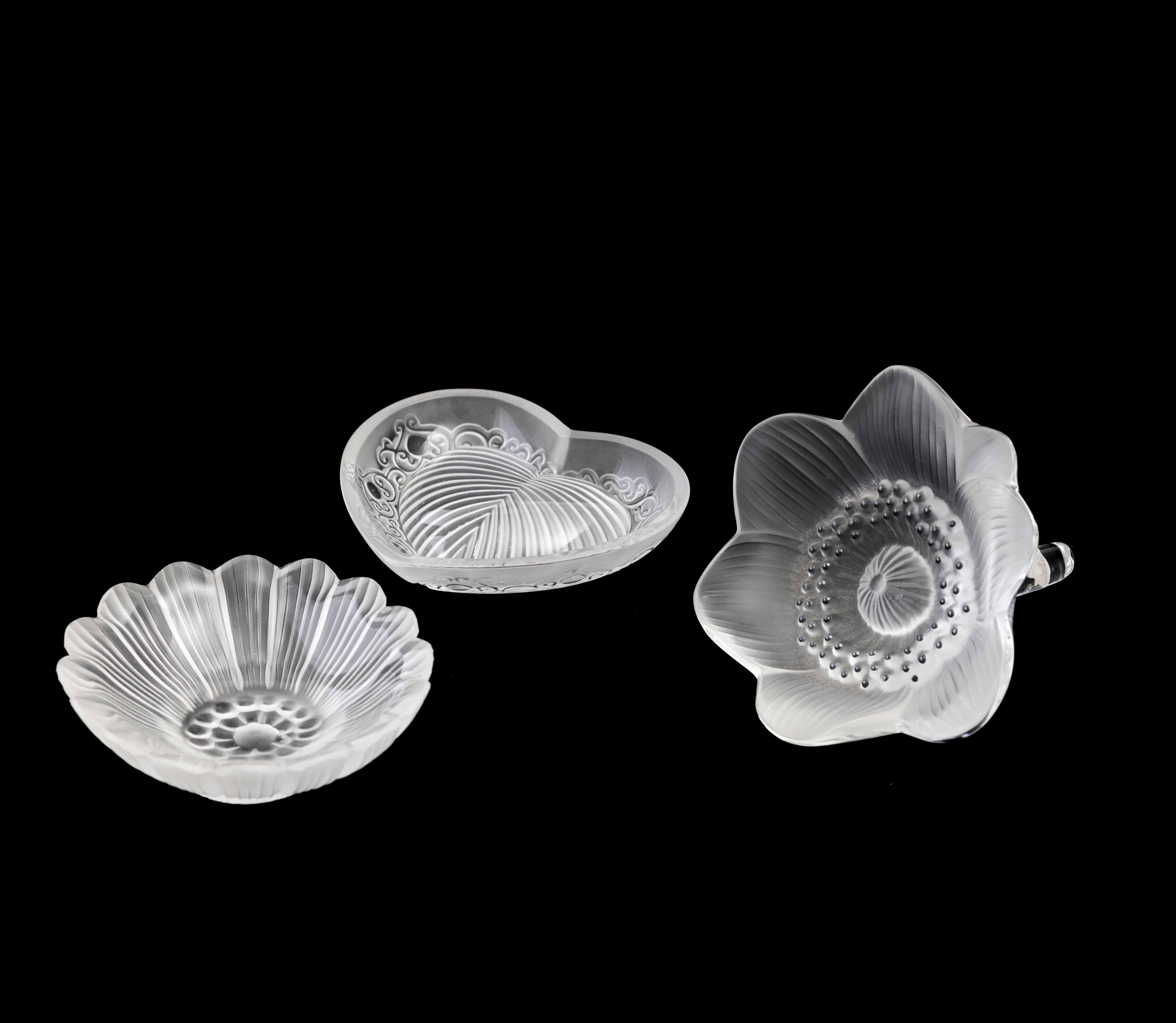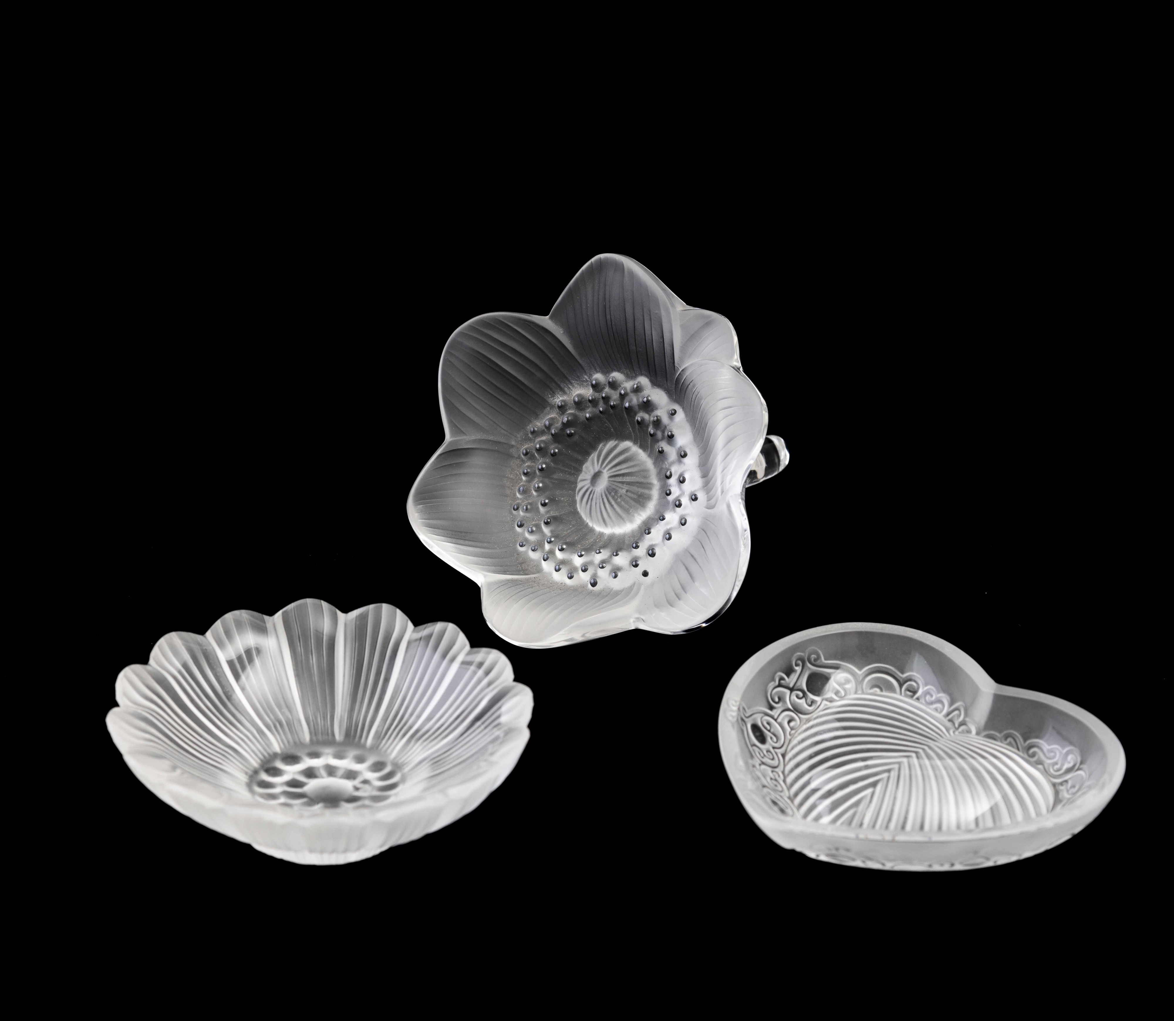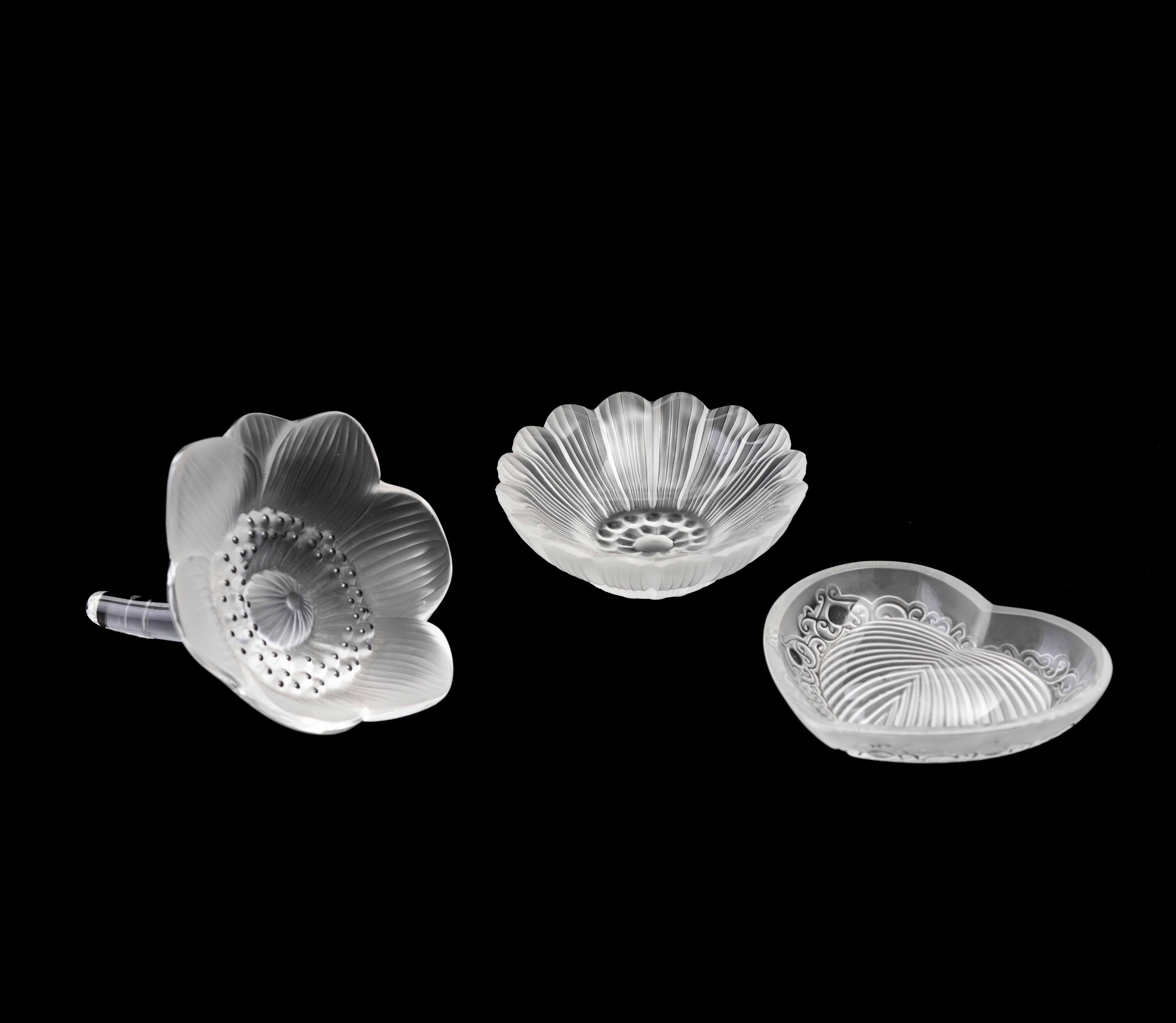 Lotto formato da due vaschette in cristallo stampato e un soprammobile in forma di fiore serie Anémones ouverte.