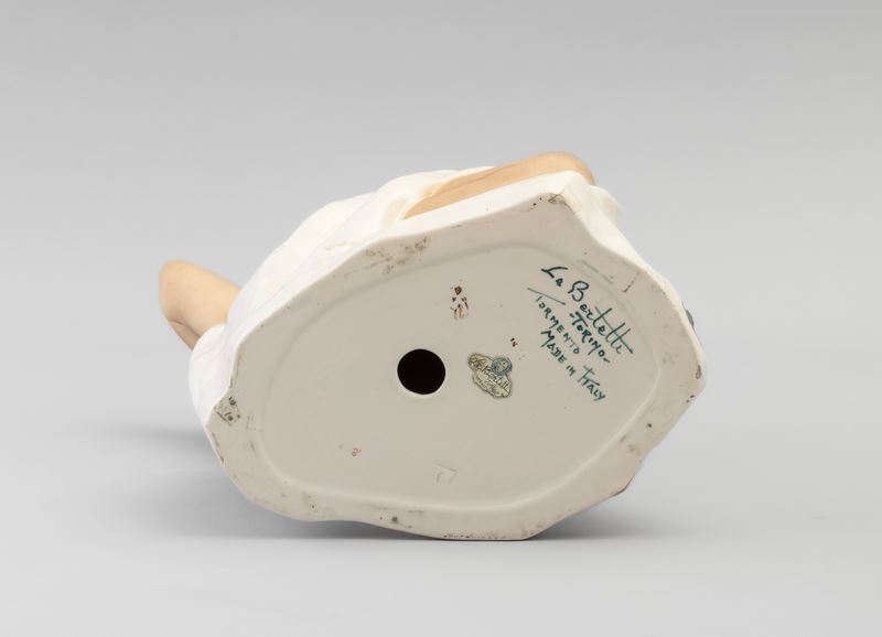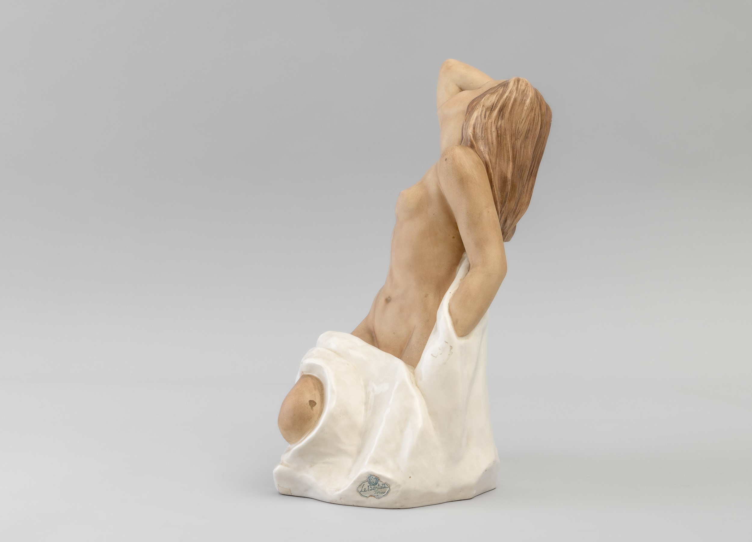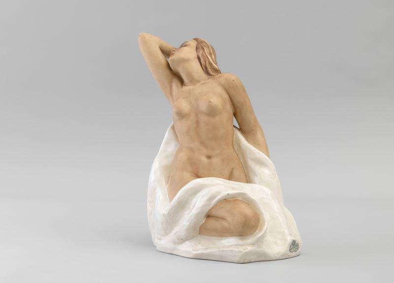 Scultura in terraglia a colaggio raffigurante nudo di donna con drappo.