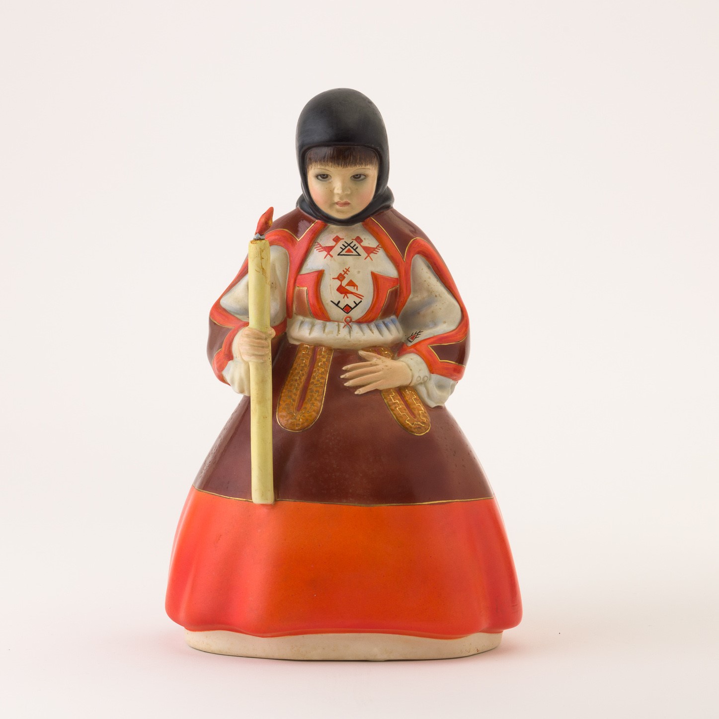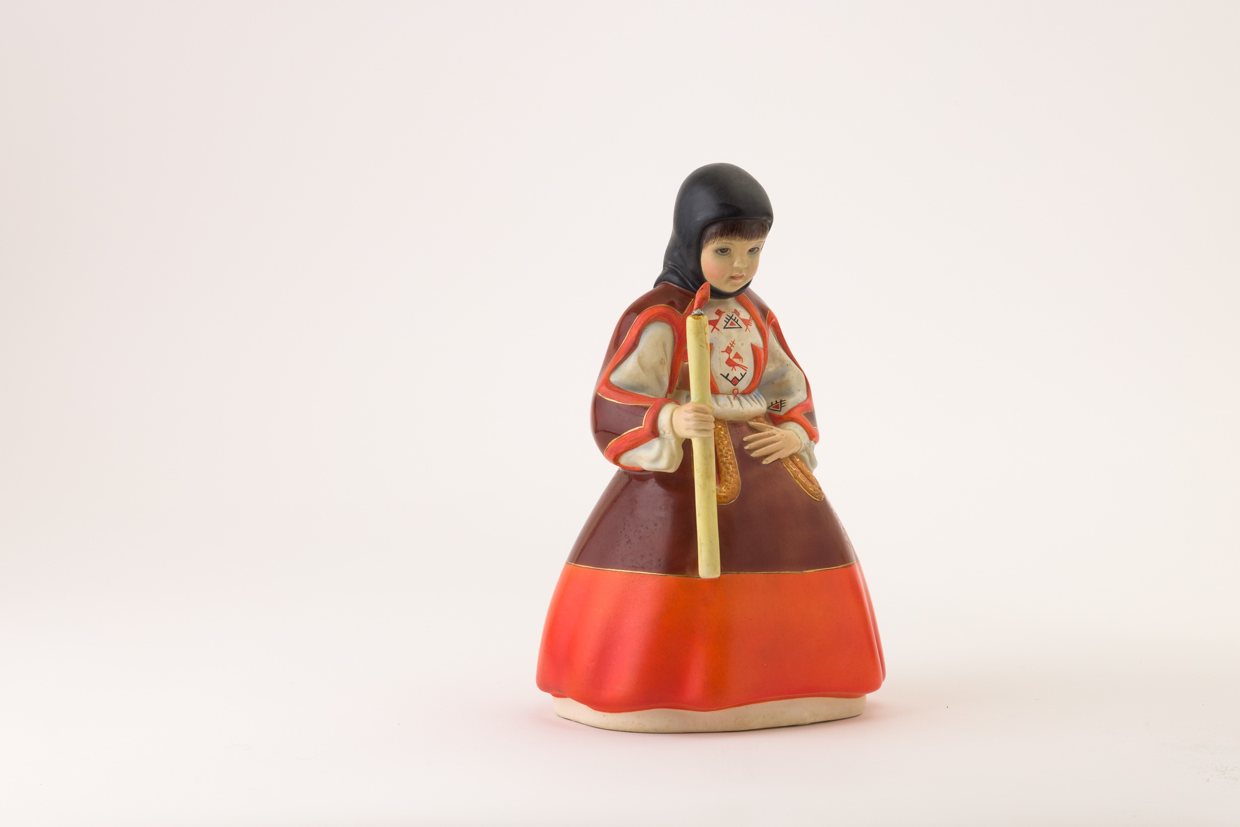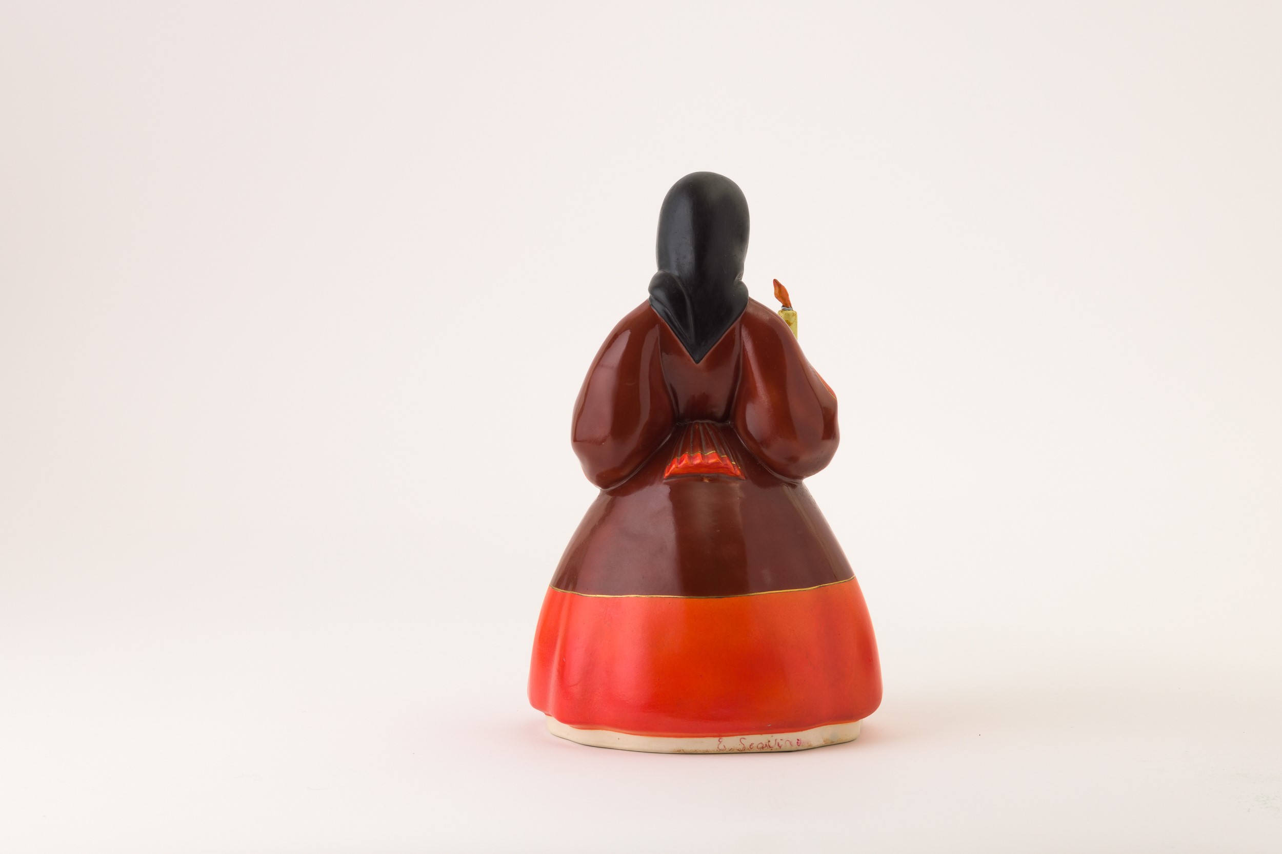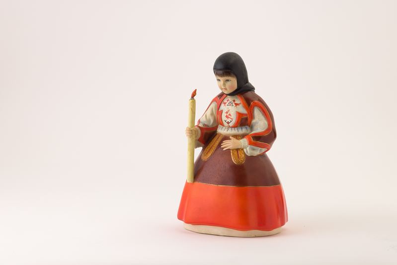 Statua in terraglia a colaggio con decoro policromo raffigurante donna con abito tradizionale sardo.