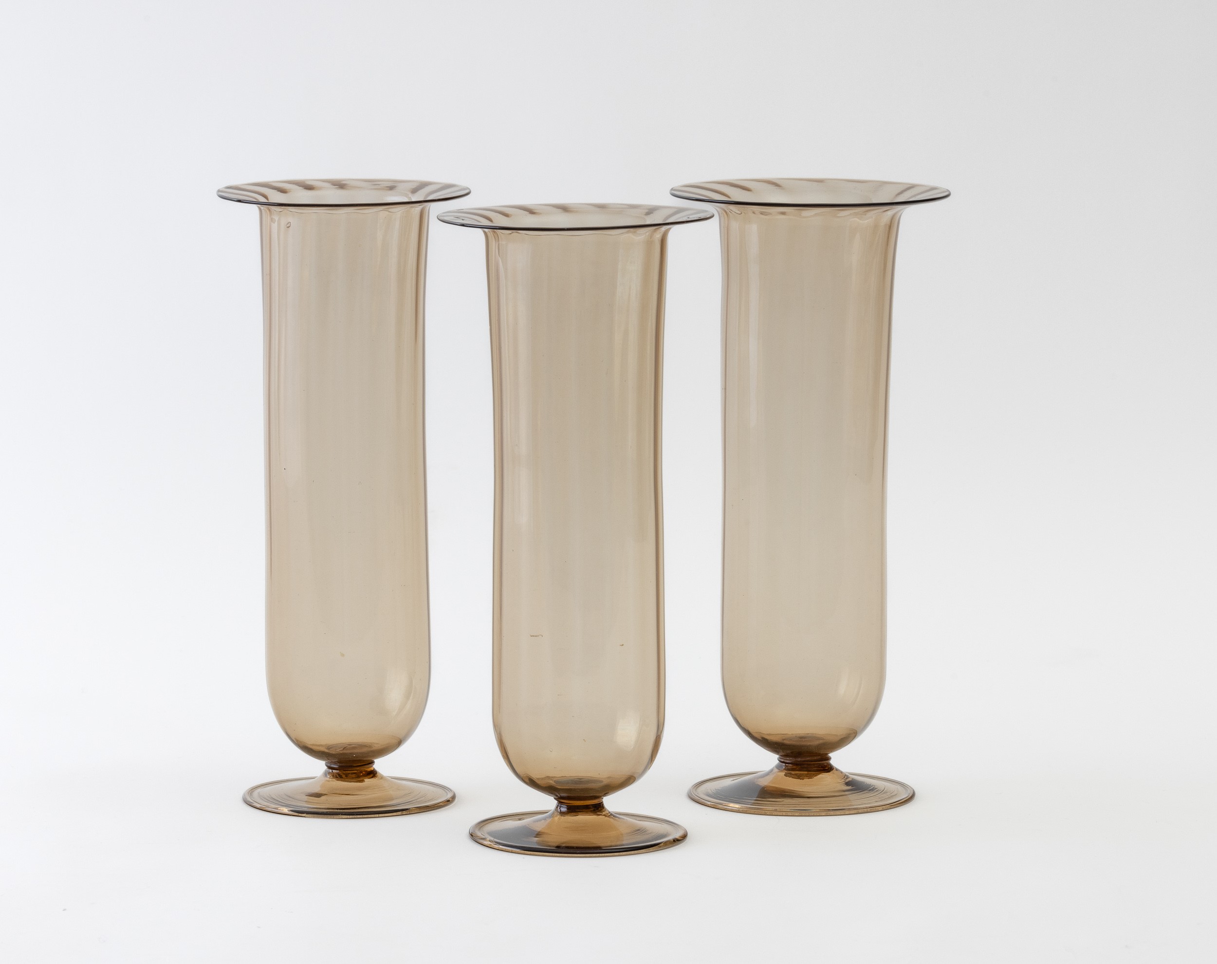 Lotto formato da tre vasi in vetro soffiato a costolature verticali.