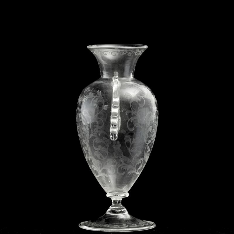 Vaso Veronese in vetro soffiato trasparente con incisione di motivi settecenteschi.