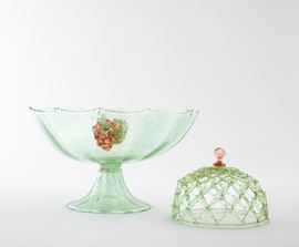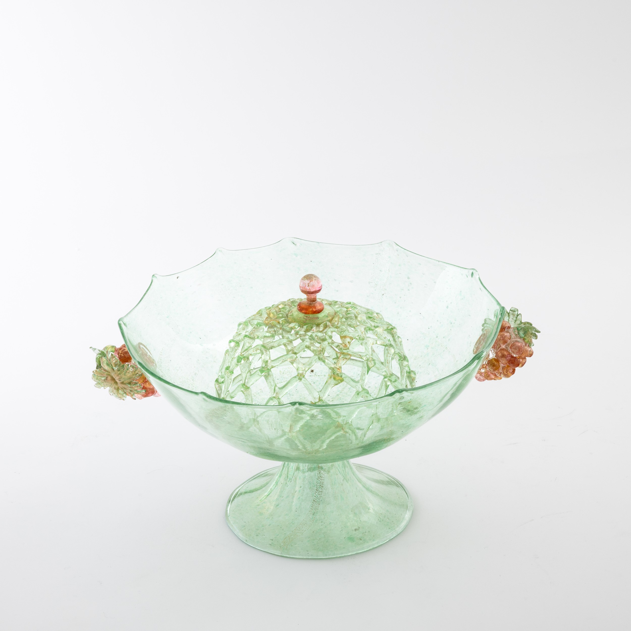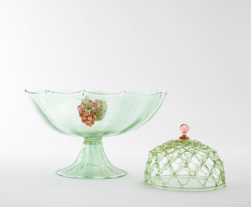 Alzata in vetro soffiato verdino e foglia oro con piede a tromba. Applicazioni in forma di grappolo e portafiori a cestello con pomolo applicato.