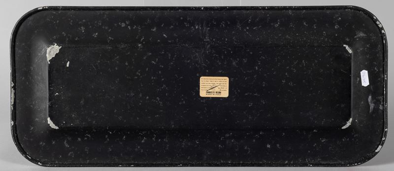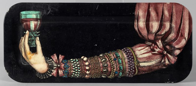 Vassoio serie Braccio ingioiellato in metallo con decoro litografato policromo.