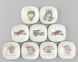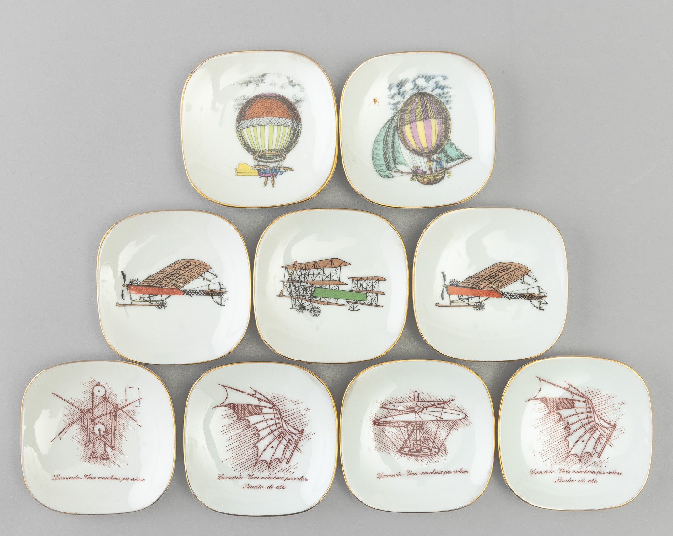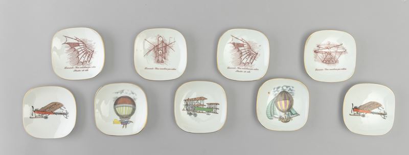 Lotto formato da nove piattini in porcellana con decoro policromo e bordo oro.
