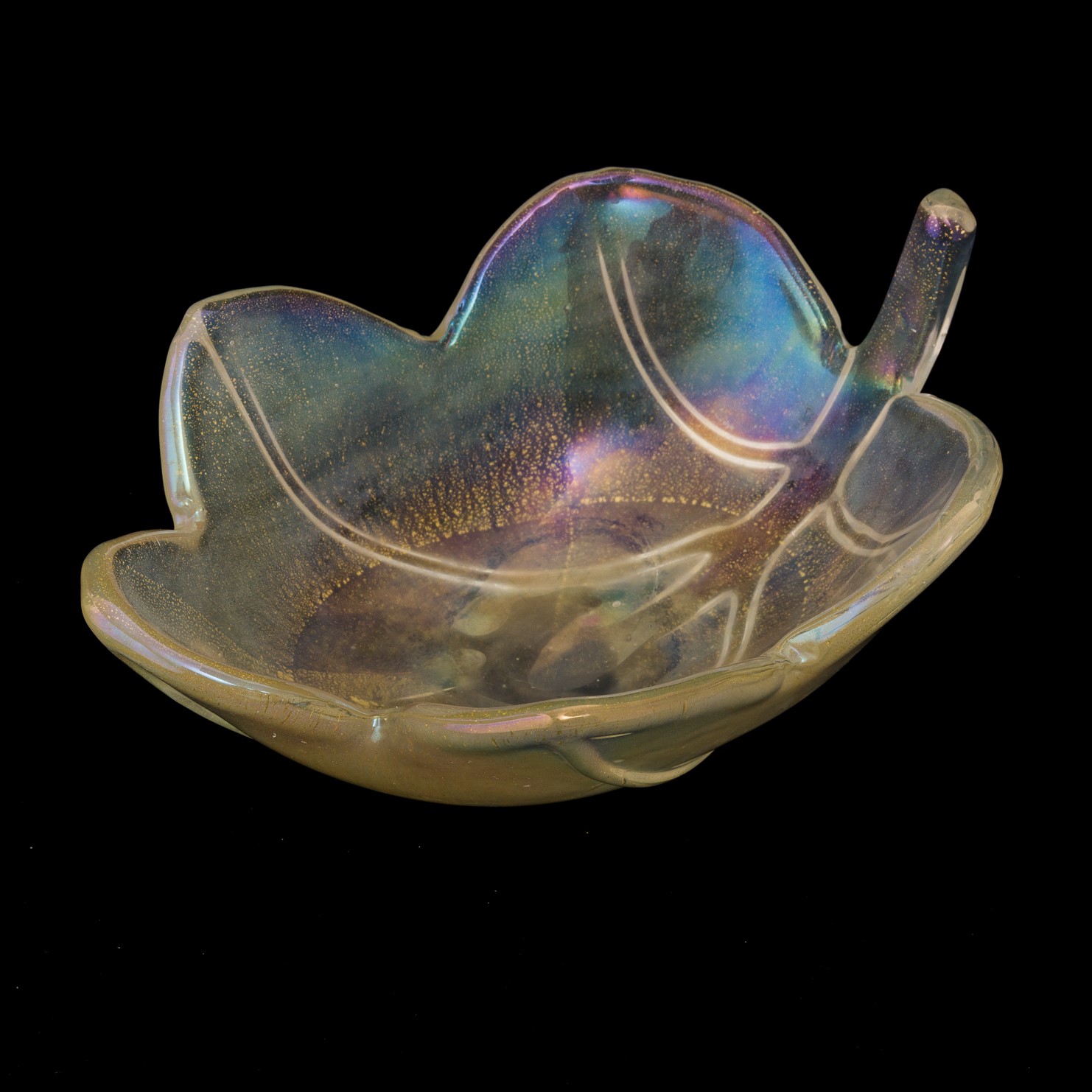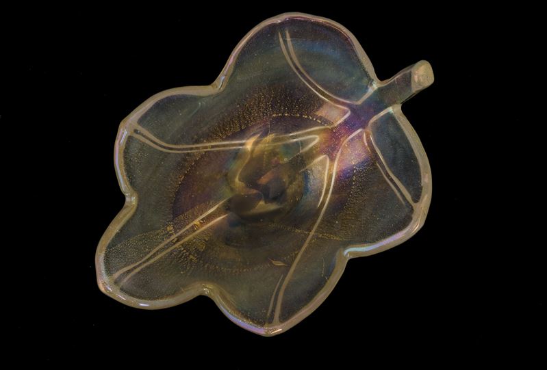Centrotavola in forma di foglia con costolature applicate e foglia oro. Superficie interamente iridata.
