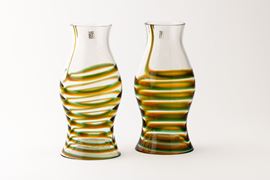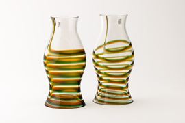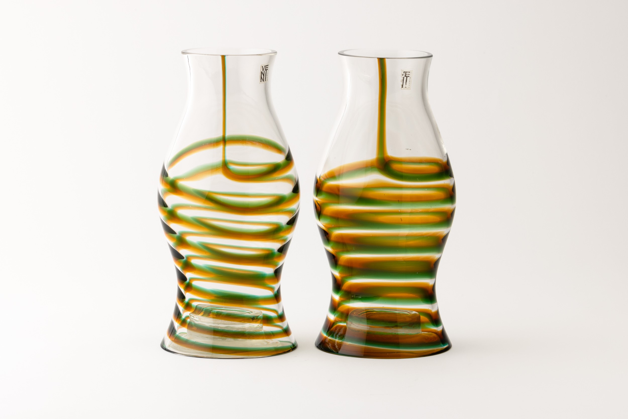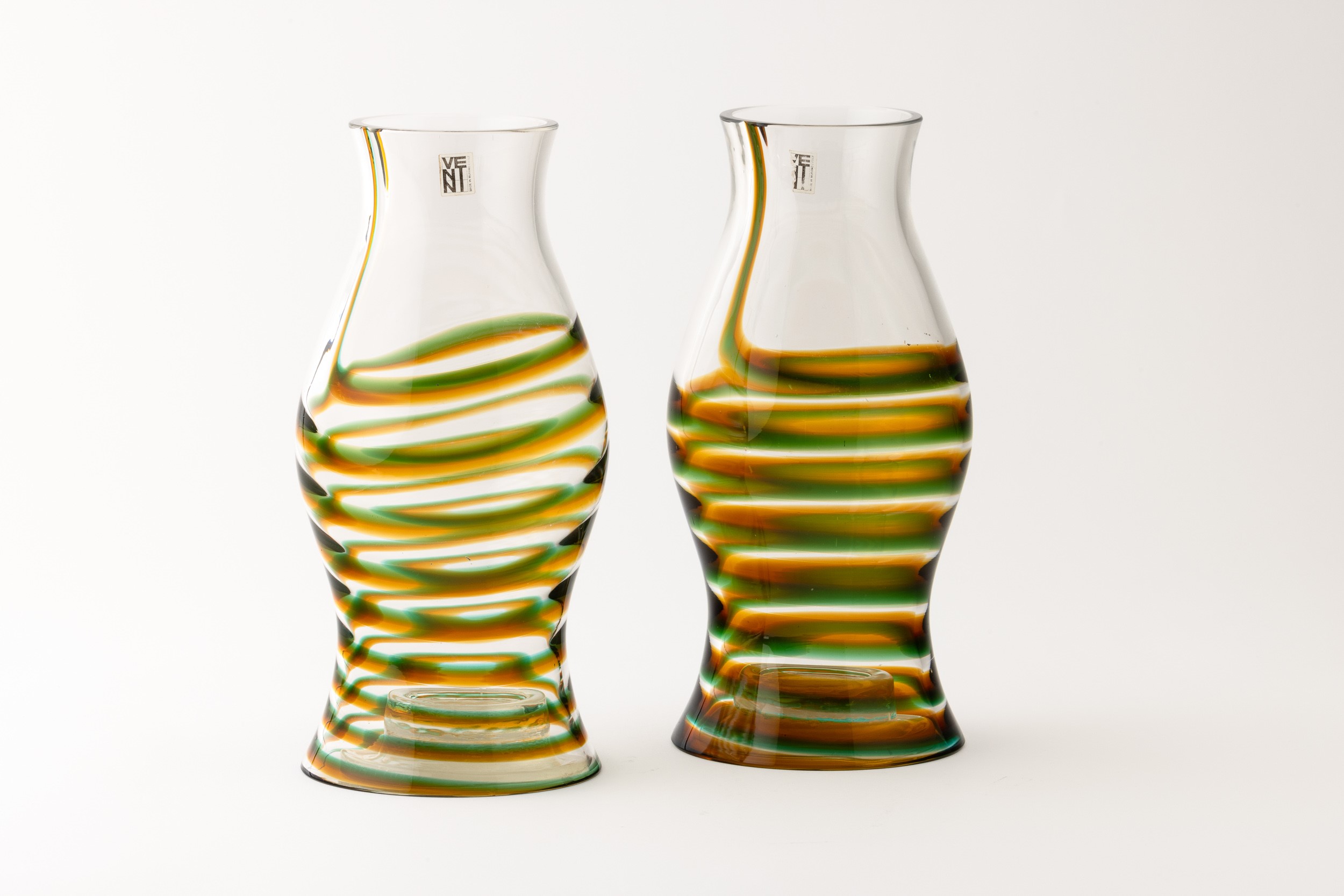 Coppia di portacandele serie Bifilo in vetro soffiato con decoro di canne colorate a spirale. Reggicandela in vetro pesante trasparente.