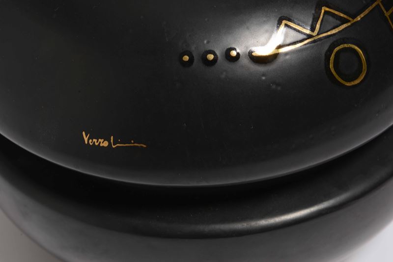 Scatola con coperchio in ceramica nera e decori oro a terzo fuoco.