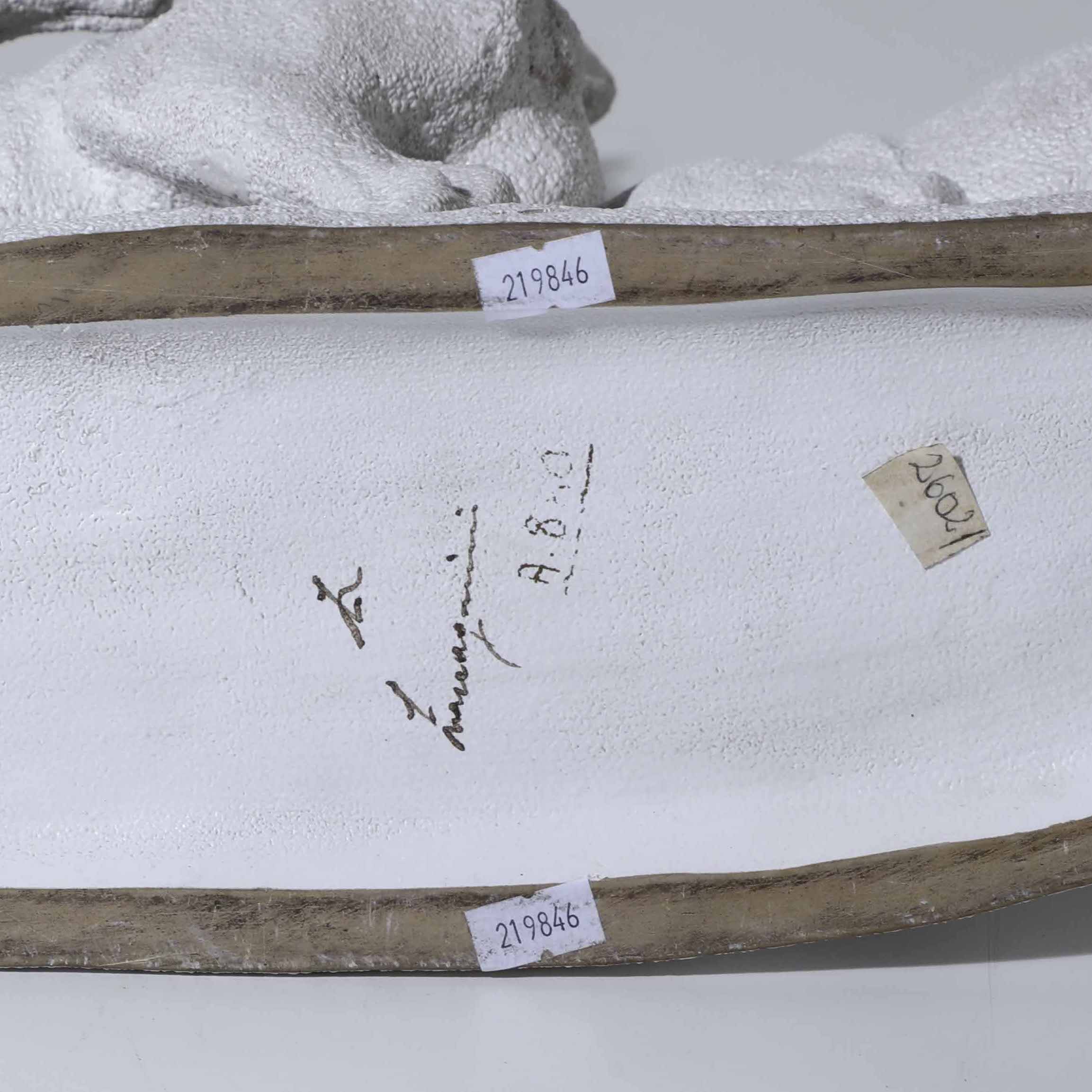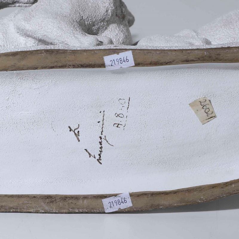 An enamelled terracotta sculpture. Broken parts and restorations, signed on the base
