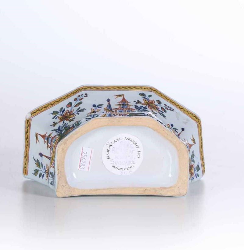 La fioriera da parete è decorata con motivi reinterpretati a Rouen dalla porcellana cinese della “famiglia verde” di epoca K’ang-hi. Un’articolata scena vede grandi pagode racchiuse entro steccati, con giganteschi fiori che si affacciano su un lago