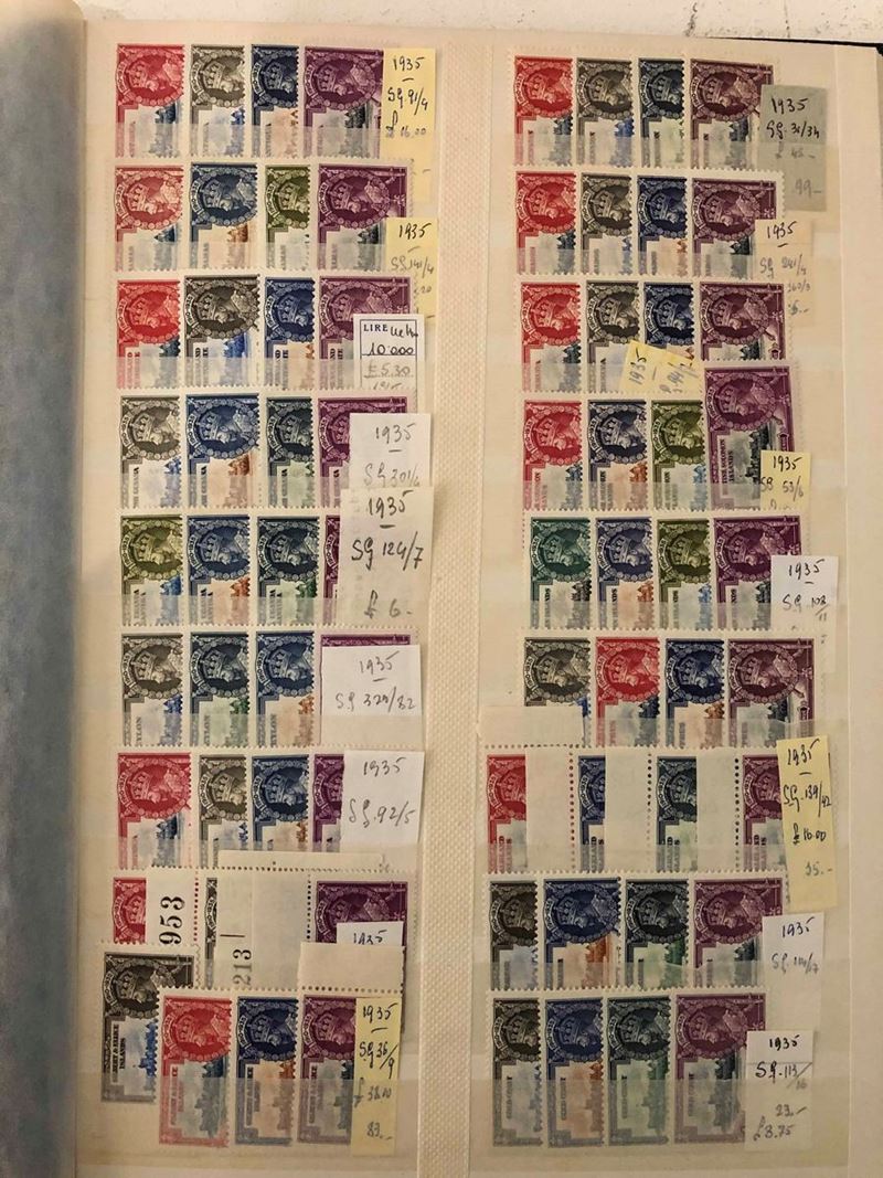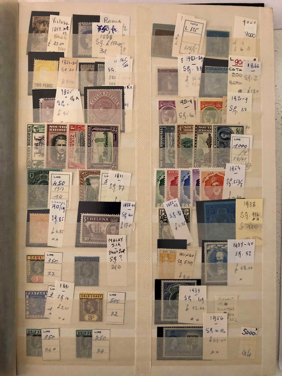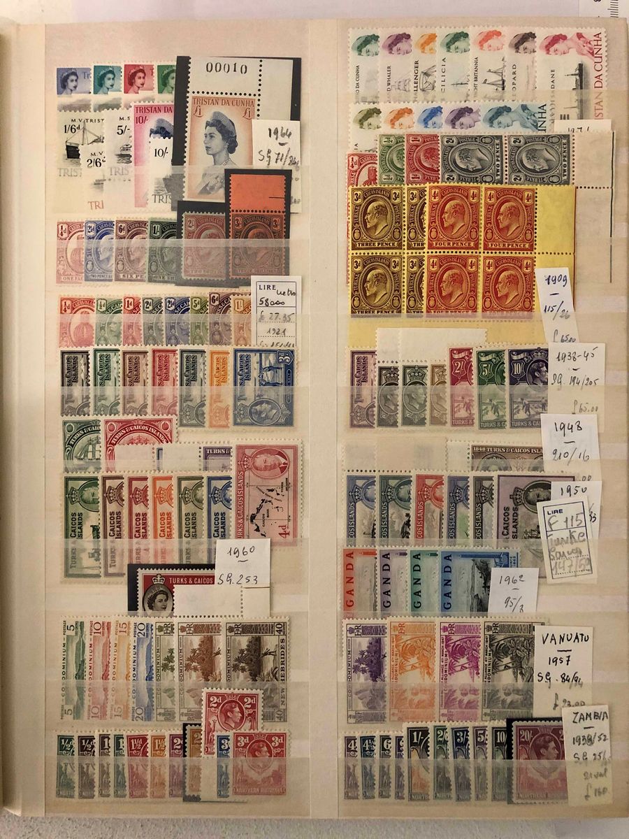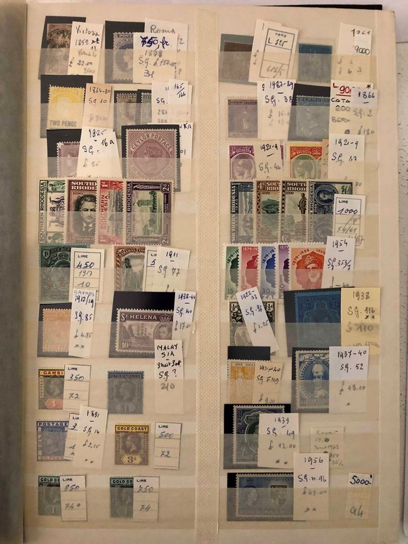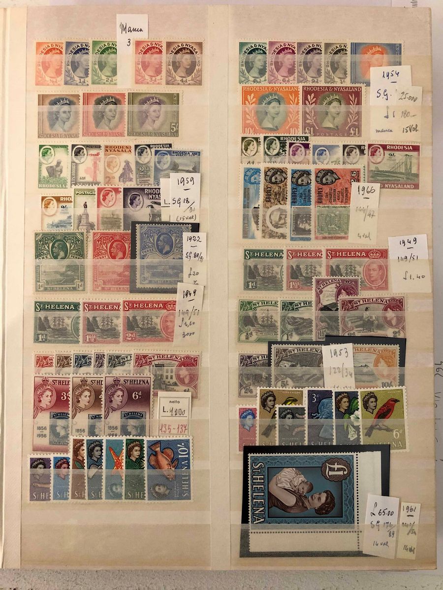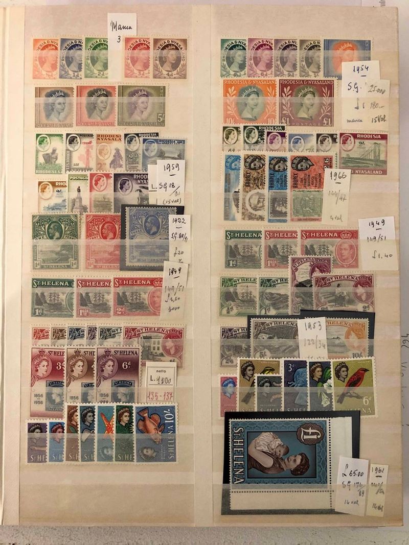 Over 650 of complete sets or single issues from Aden to Zanzibar, Q. Victoria to Q. Elizabeth II era in three albums. From S.G. £ 10,00 up to £ 100,00 value, and some sets more. Very good quality, some of the first issues with lightly hinged, some sets repeated, the most unmounted mint. Great value of catalogue. Generally fresh and attractive.