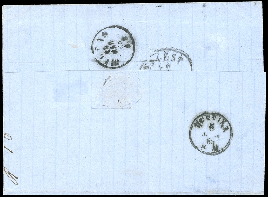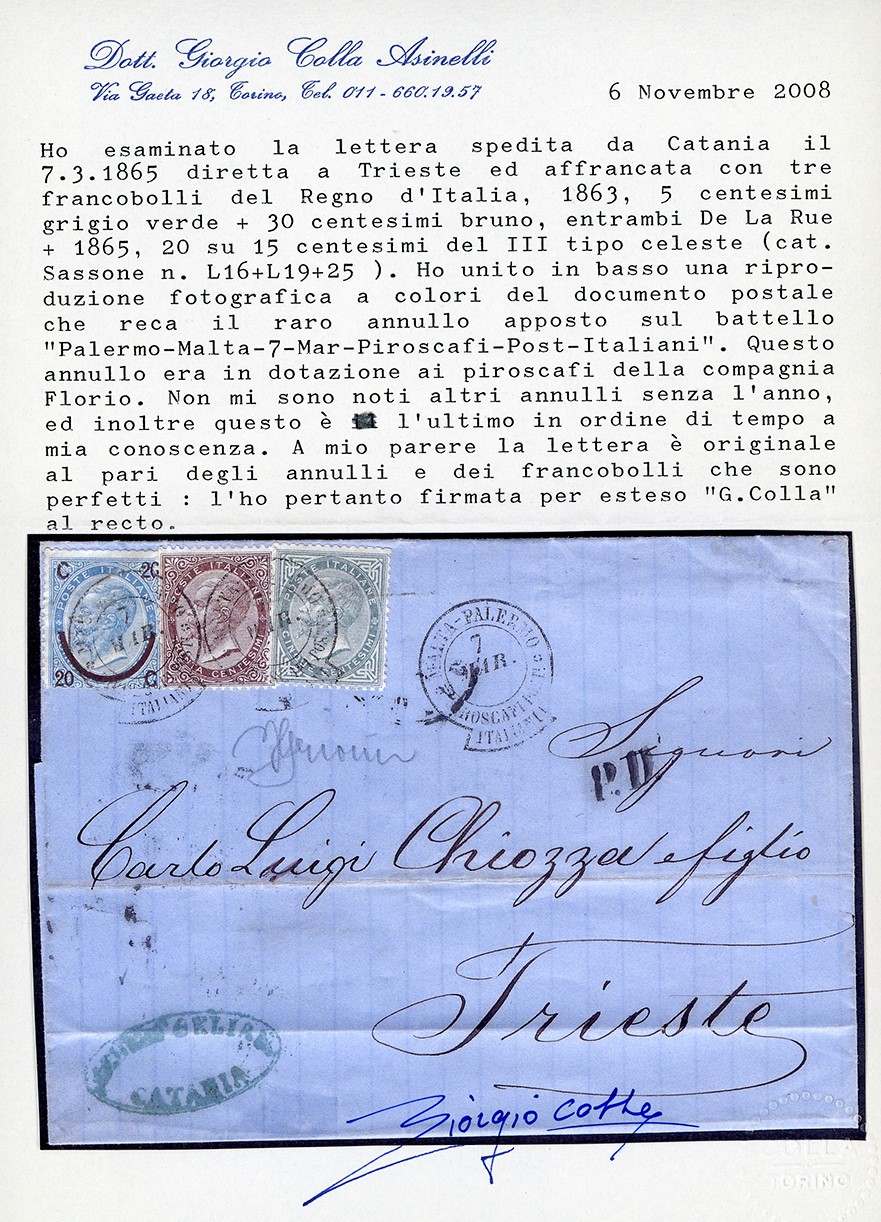 affrancata con 5 e 30 cent. DLR (S. L16, L19) e 20 cent. III tipo “ferro di cavallo”, annullati dal bollo “Malta/Palermo-Piroscafi Postali Italiani – 7 mar” (S. P. 11 - senza anno), in dotazione al piroscafo Leone della Compagnia Florio, proveniente da Malta. La lettera fu sbarcata a Messina per essere imbarcata su un vapore della Compagnia Peirano e Danovaro in servizio lungo le coste dell’Adriatico fino a Trieste. Lieve piega sui tre esemplari, rara affrancatura e destinazione. Cert. G. Colla.
